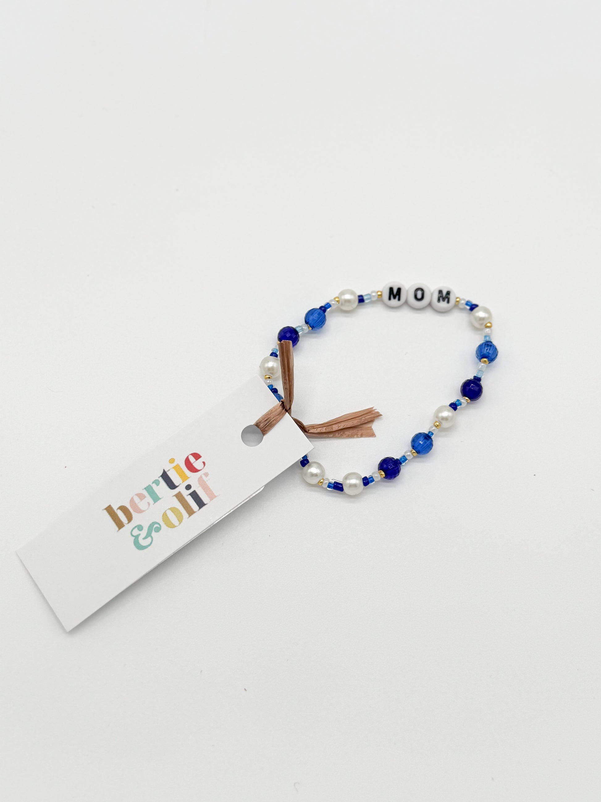 Blue Beads with pearls and Letter Mom Beads. Pearl like beads with a smooth, shiny finish. Dark and light blue translucent beads, some faceted for sparkle and dimension.