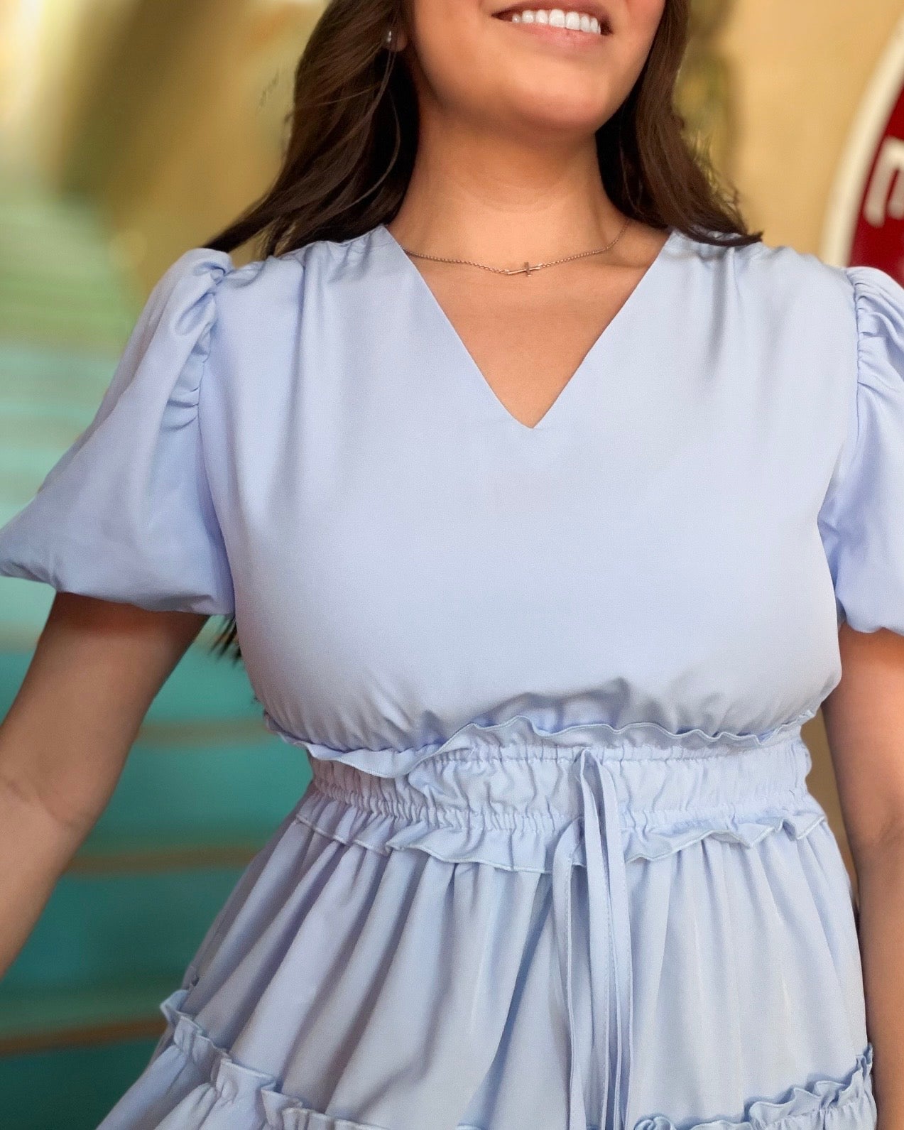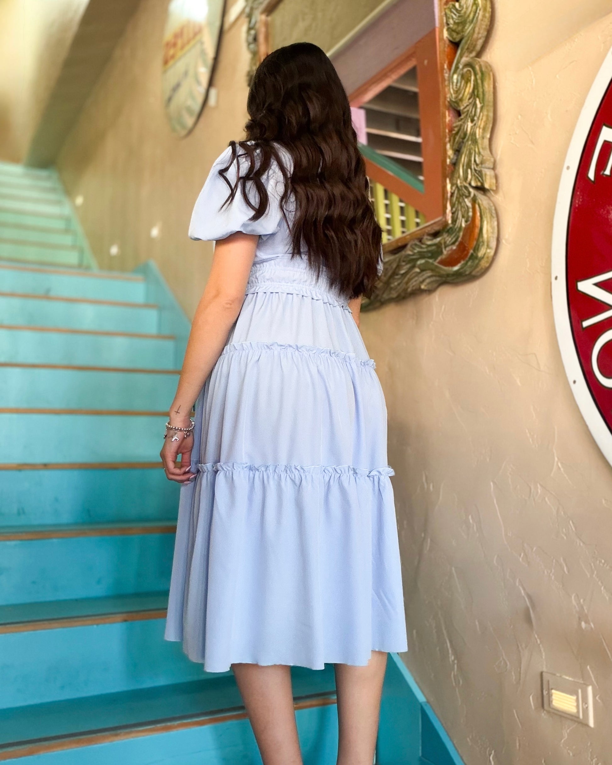 This soft blue midi dress features a flattering V-neckline, puff sleeves, and a stretchy elastic waist for the perfect comfortable fit. Finished with tiered ruffle details for a flowy, feminine silhouette you’ll love from brunch to baby showers.