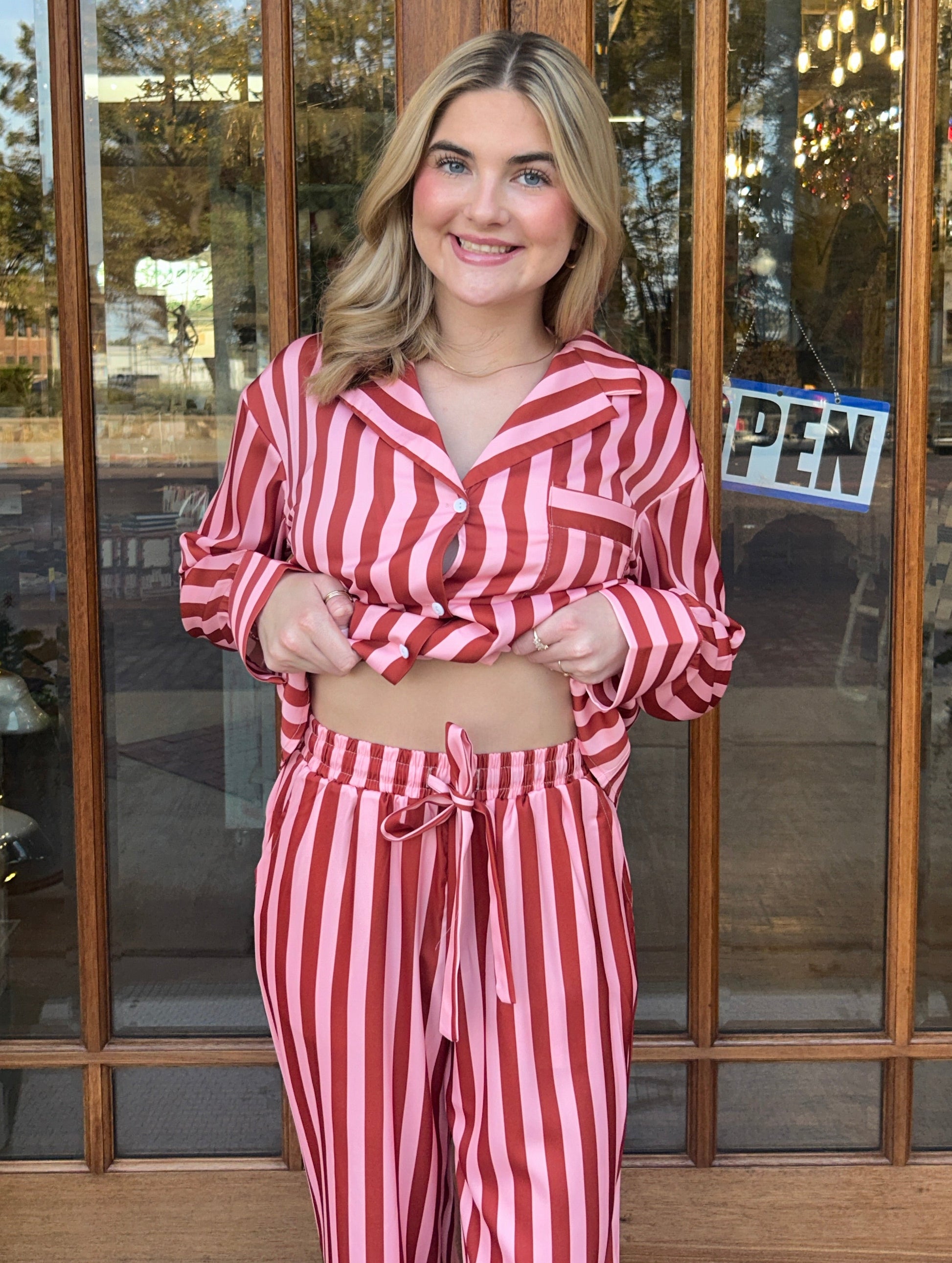 Say hello to the ultimate pajama pant set for slumber parties, self-care nights, and Sunday lounging. This blush striped satin set is silky-smooth with a flattering, true-to-size fit. The top features a button-down front and cute front pocket, while the pants include an elastic waistband and—bonus—they have pockets! These stripe satin pajamas are made for boutique babes who love looking put together, even in their PJs. Stock up and let your shoppers live out their pajama party dreams in style.