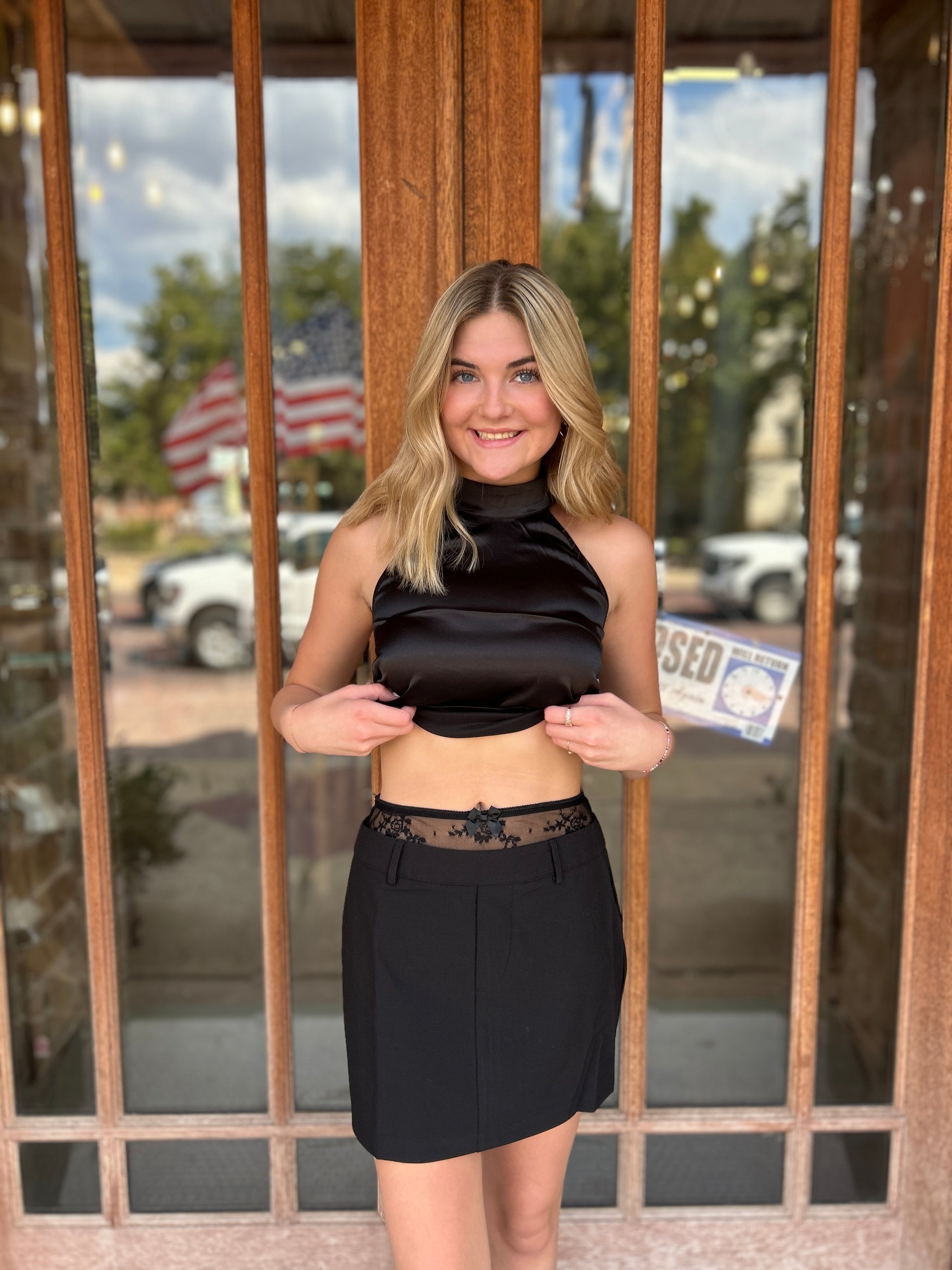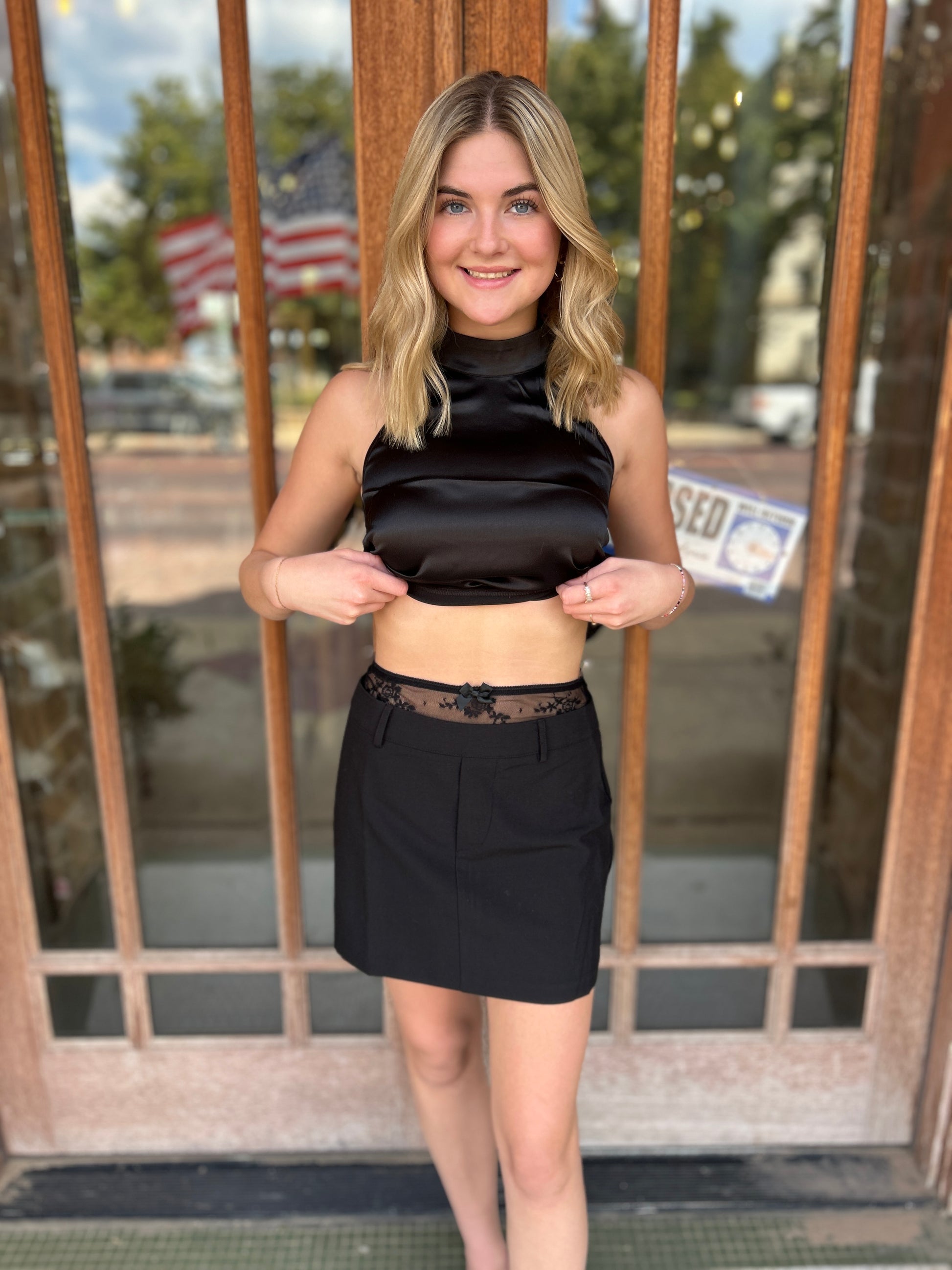 A stylish black mini skirt featuring delicate lace detailing and a contrasting waistband for a flattering finish.
