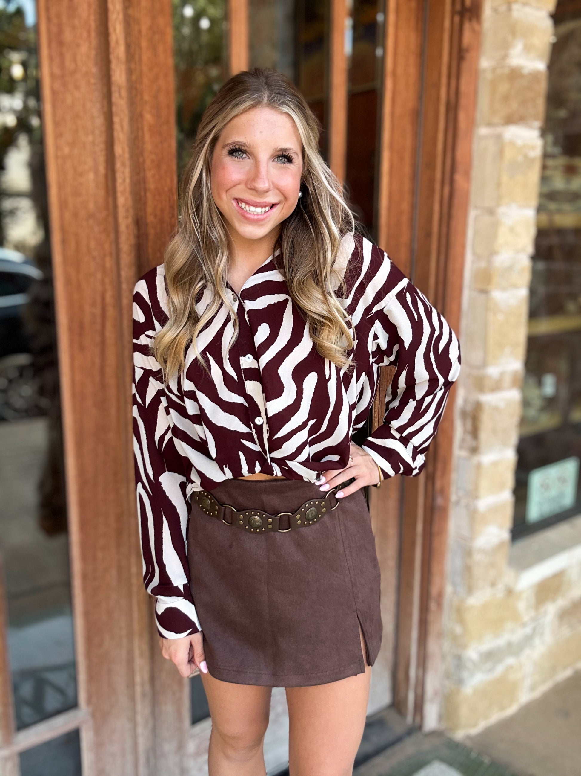 Chocolate brown suede mini skirt featuring a front slit and wide studded belt detail, offering a chic western-inspired style.
