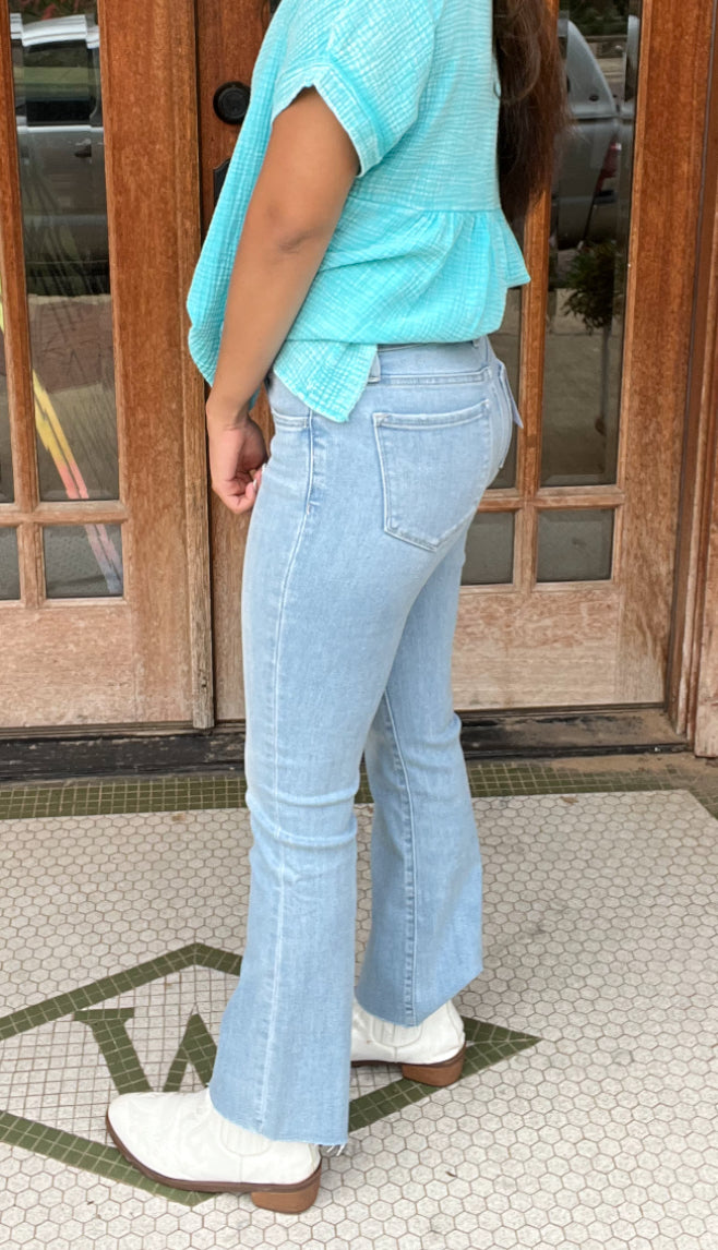 Mid rise ankle bootcut jeans. Comfort stretch denim. Mid rise waist. Clean cut raw hem. Ankle length. Bootcut jeans.