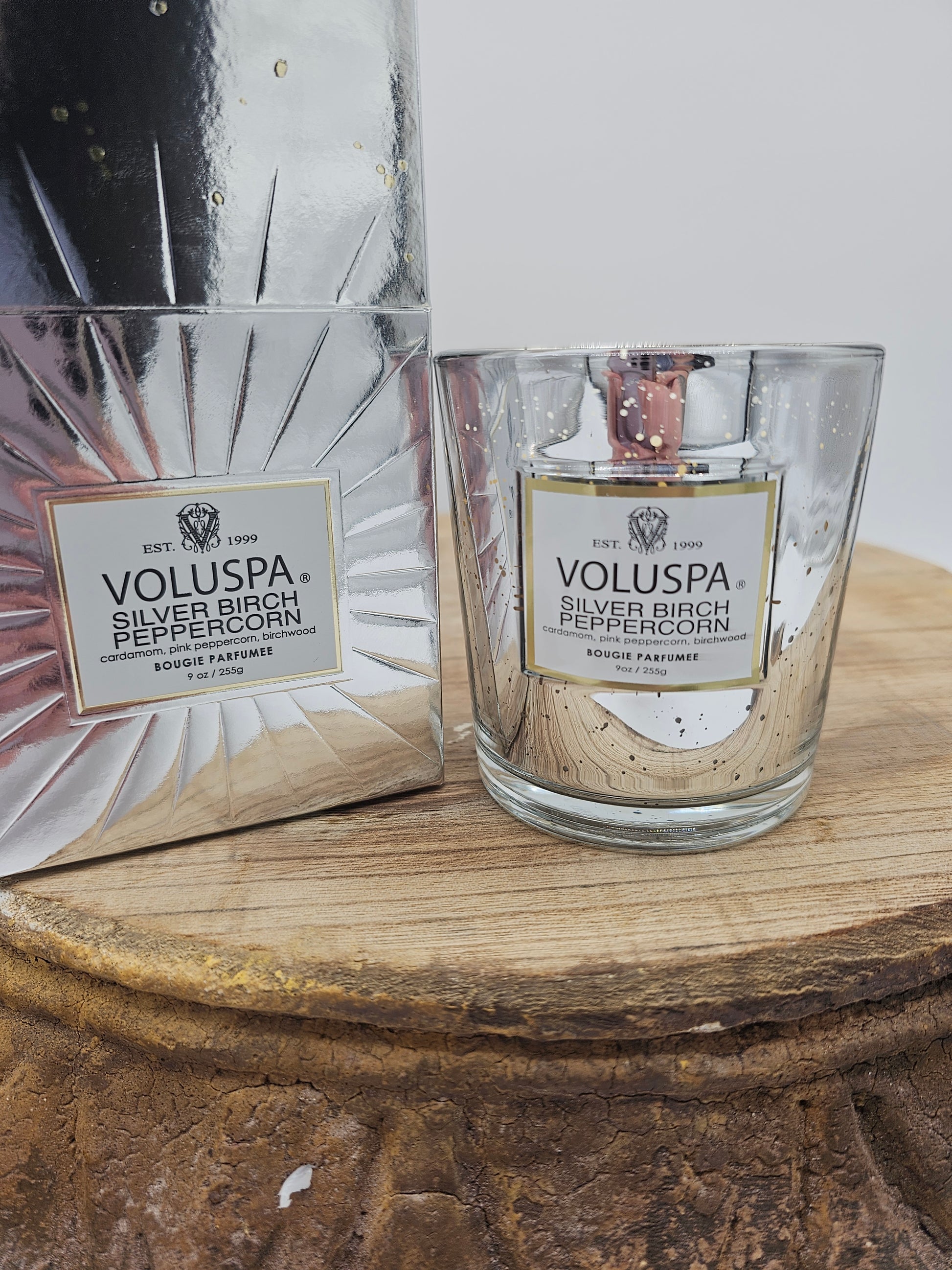 Voluspa Silver Birch Peppercorn Candle – A sleek glass jar candle with a shimmering silver finish, offering a sophisticated blend of cardamom, pink peppercorn, and birchwood. Hand-poured for a clean, even burn. Net weight 9 oz / 255 g.