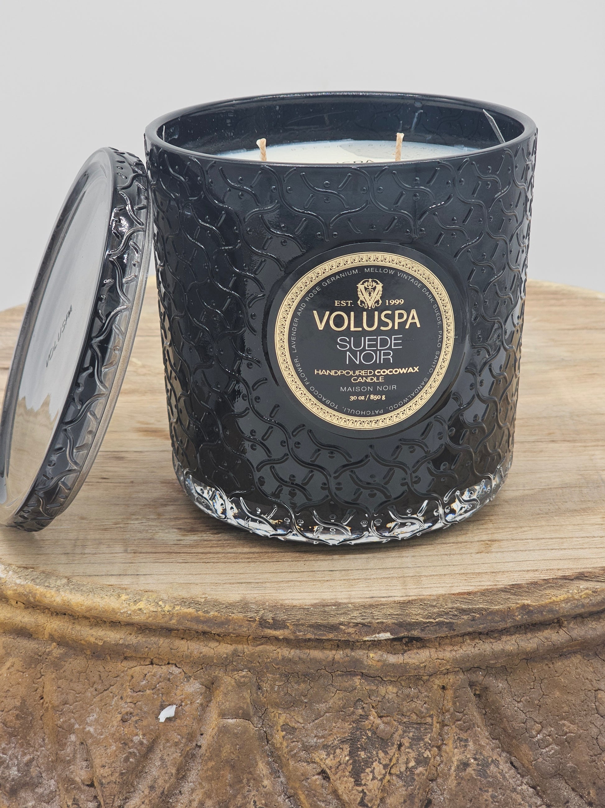 Voluspa “Suede Noir” candle – a deep, luxurious fragrance blending mellow vintage suede with aromatic lavender and rose geranium. Hand-poured in Voluspa’s signature coconut wax, this 30 oz candle is housed in a striking embossed black glass vessel, adding a bold and elegant touch to any space while creating a warm, sophisticated ambiance.