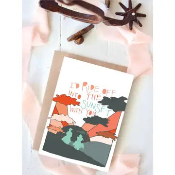 Romantic with a western twist, this card features a dreamy desert sunset scene with bold mountains, layered clouds, and two cowboys on horseback riding into the horizon. The message “Ride off into the sunset with you” captures timeless love and adventure—perfect for anniversaries, Valentine’s Day, or just letting your partner know they’re your forever cowboy.