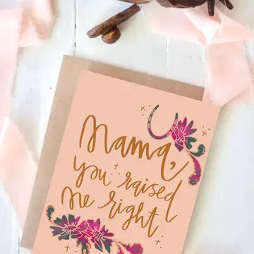 A heartfelt nod to mama with a western twist. This card features the sweet message "Mama, you raised me right" in flowing script, accented with bold pink florals and a cowboy rope detail. It’s the perfect blend of gratitude and grit—great for Mother’s Day, birthdays, or just to remind her she did a dang good job.