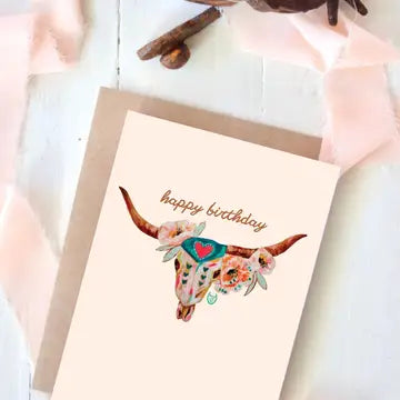 Card | Western Cowgirl Steer Skull Floral Birthday Card