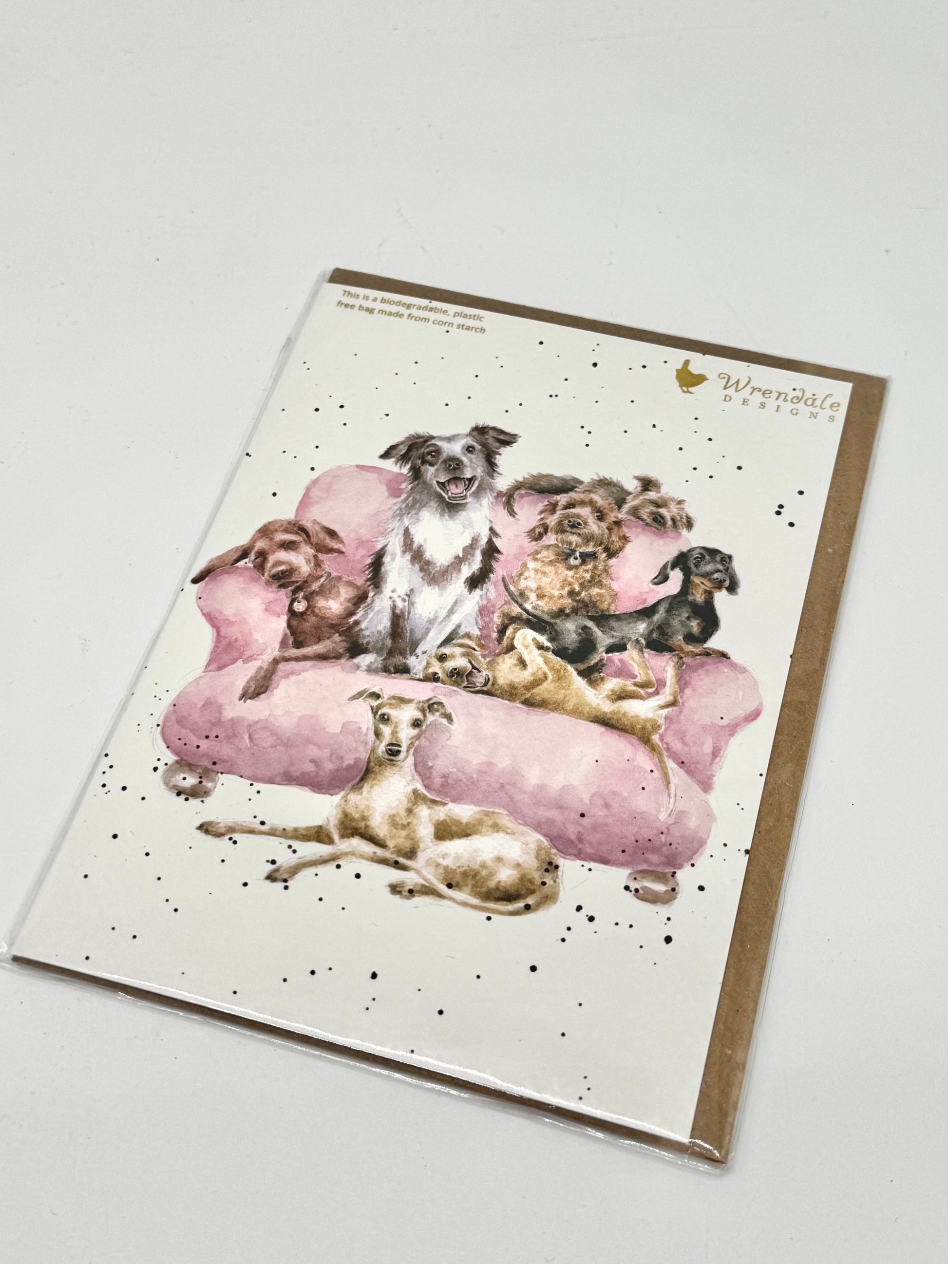 Filled with charm and canine cuteness, this Wrendale Designs card showcases a delightful bunch of dogs lounging together on a plush pink couch. With playful watercolor detail and plenty of personality, it’s perfect for dog lovers and any occasion. Blank inside so you can make it your own—whether it's a birthday, thank-you, or just because. Comes with a kraft envelope and eco-friendly packaging.