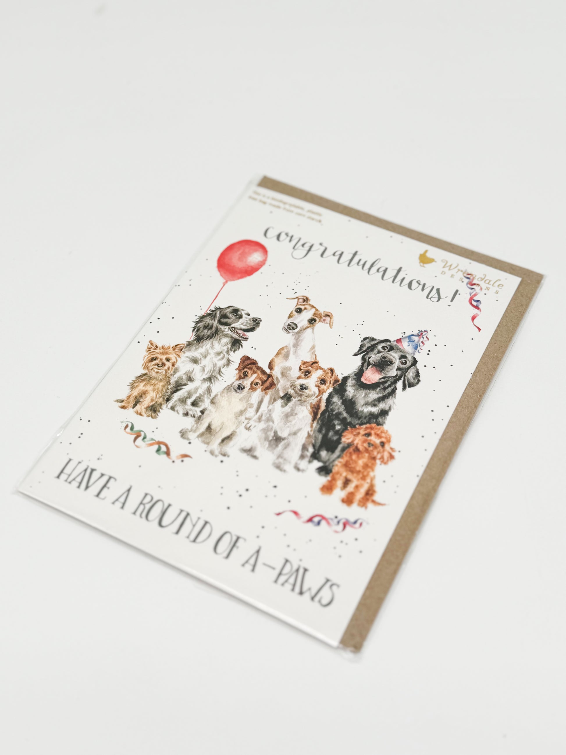 Celebrate in tail-wagging style with this cheerful card from Wrendale Designs! Featuring a joyful pack of party-ready pups, festive confetti, and the message “Have a round of a-paws!”, it’s the perfect way to cheer someone on for any big win—graduation, promotion, new home, or just being awesome. Printed on textured, eco-friendly board with a coordinating kraft envelope.