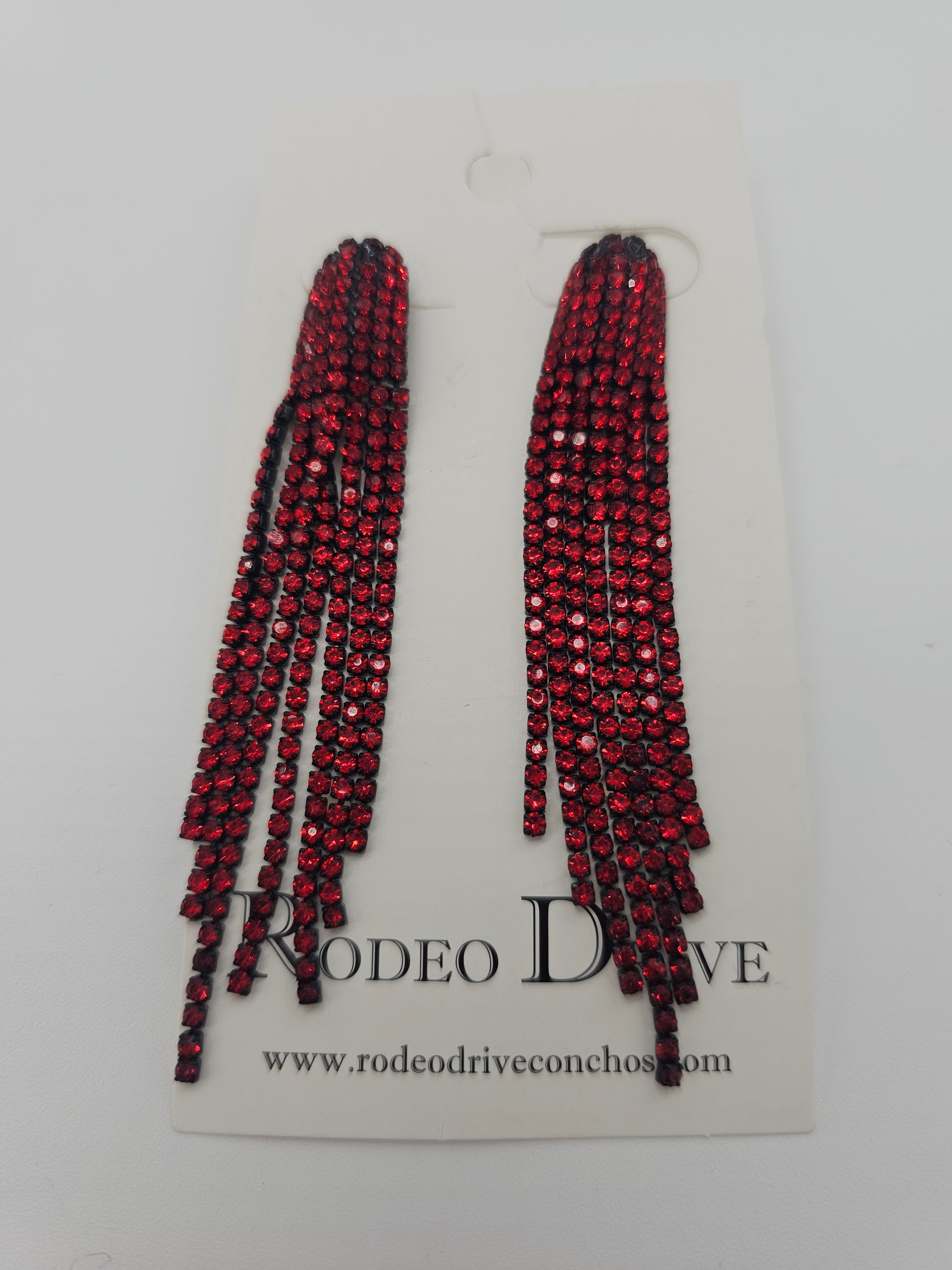 Red rhinestone fringe earrings with a bold boho western vibe. These eye-catching dangles bring sparkle and movement, perfect for adding flair to any outfit—from rodeo nights to country concerts. Lightweight with serious statement power.