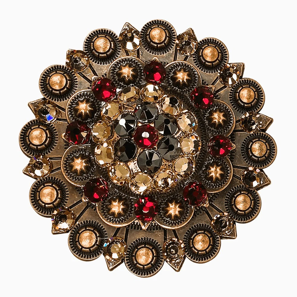 Vintage-style rag slide with intricate gold, black, and red rhinestone detailing. Adds a touch of Western flair and elegance to your bandana or scarf look. Perfect for rodeo days, country nights, or styling with a classic twist.