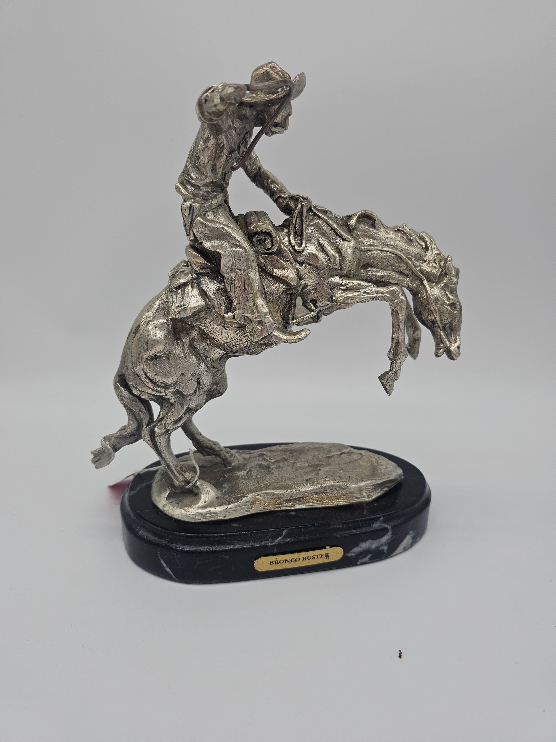 Add a bold Western statement to your space with this striking "Bronco Buster" Sculpture. Crafted in a silver-toned metal finish, this dynamic piece captures the raw energy of a cowboy mid-ride on a bucking bronco. Mounted on a sleek black marble-style base with a brass nameplate, it’s perfect for Western-themed décor, collectors, or anyone who appreciates rugged American spirit and artistry. A timeless tribute to rodeo heritage and frontier bravery.