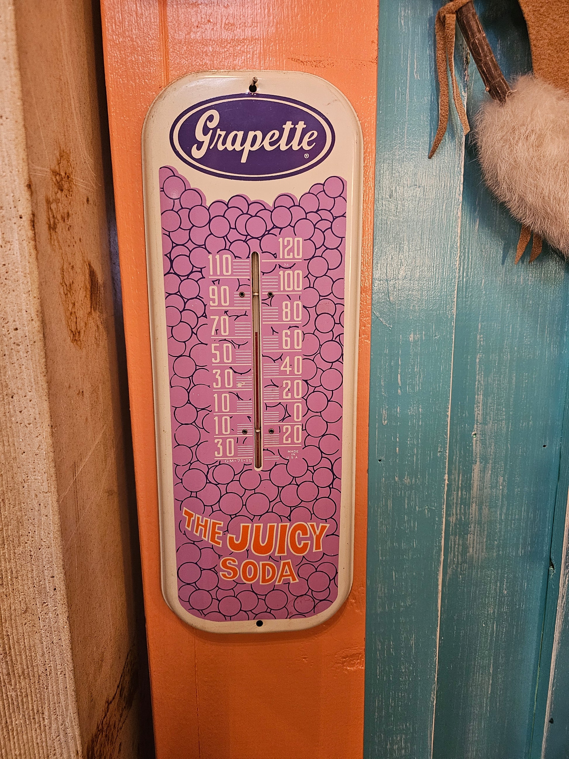 Vintage Grapette soda advertising thermometer with a bright purple grape cluster background and bold retro lettering. It reads “Grapette – The Juicy Soda” and features a vertical temperature gauge in the center. This collectible piece combines colorful mid-century soda advertising with practical use, making it a nostalgic display item full of charm.