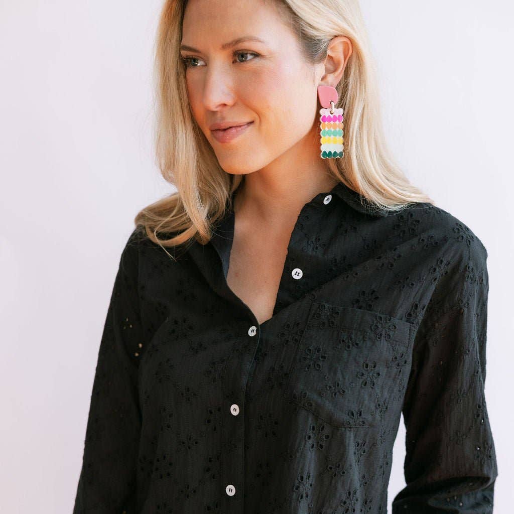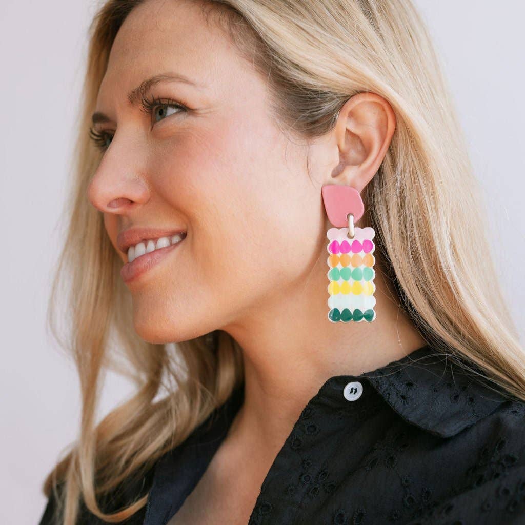 We couldn't keep this style in stock last season so we had to bring them back in a new colorway! Our Atlantic Cabana Earrings featuring vibrant rainbow hues and a fun scalloped edge. These lightweight statement earrings are the perfect way to add a playful touch to any outfit.