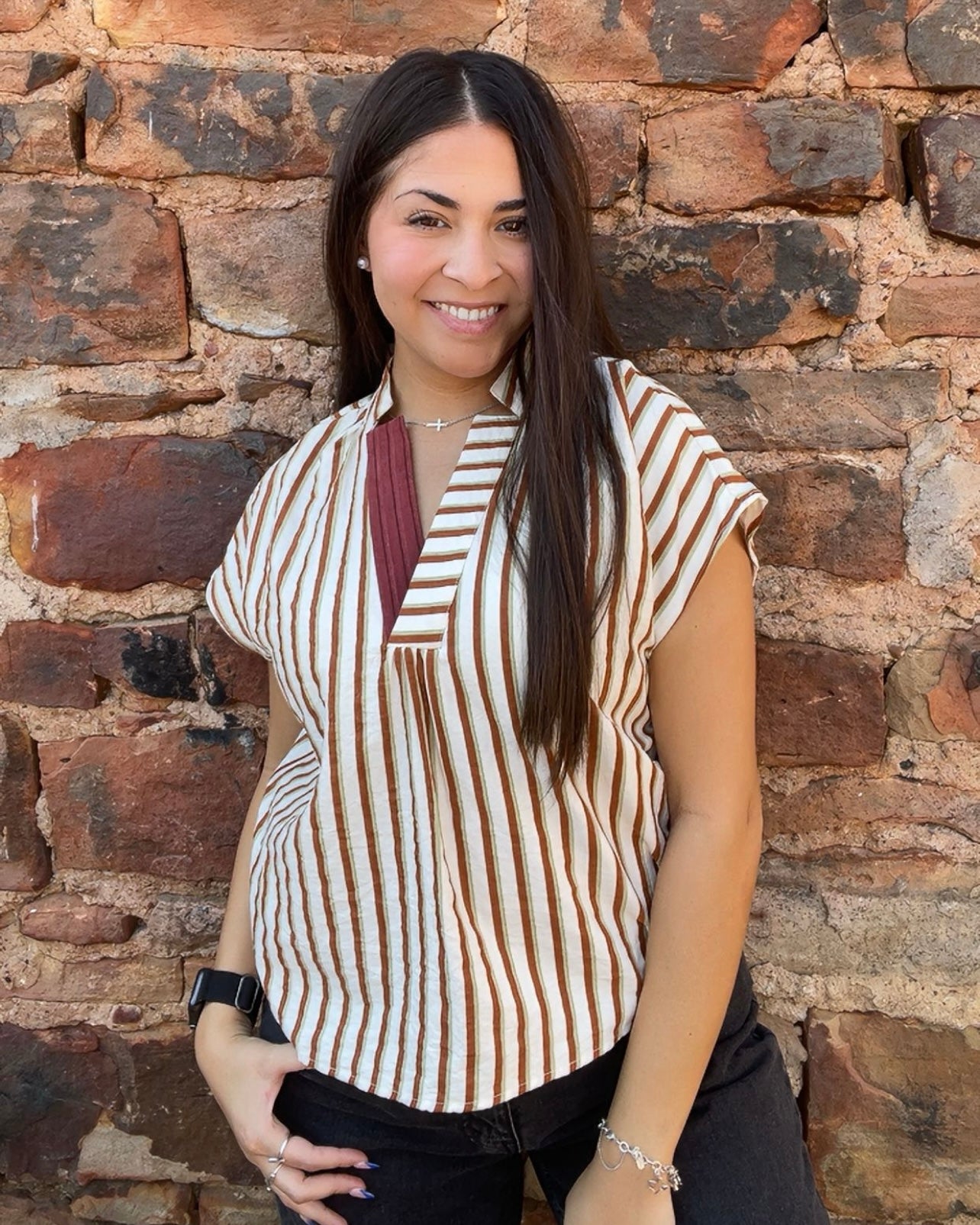 Top | THML Brown Blouse Contrast V-Neck Striped