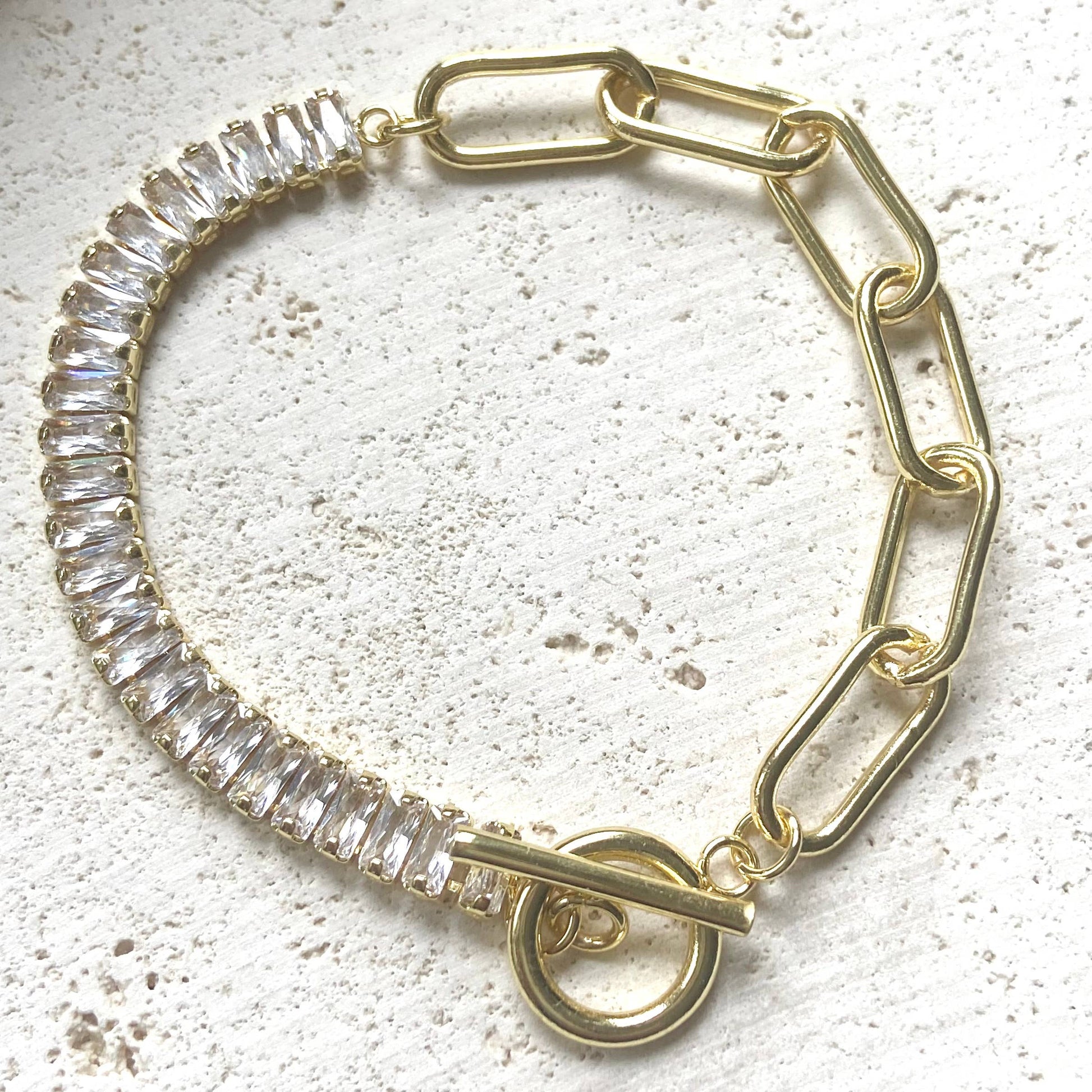 This sparkling crystal and gold paperclip chain bracelet is so trendy and classy. These make perfect easy gifts. Toggle closure