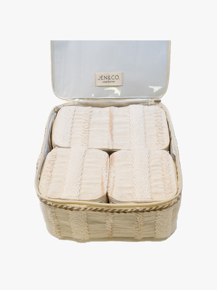 The CS2147 Fiona Cotton Cosmetic Case is perfect for organizing makeup and accessories on the go. With a wide zipper opening and three small zip cases inside, it ensures efficient organization. Crafted from durable cotton, it includes a convenient handle for easy carrying. Sized at 9.5" length, 9.5" height, and 4.5" depth, it's ideal for all your beauty essentials.