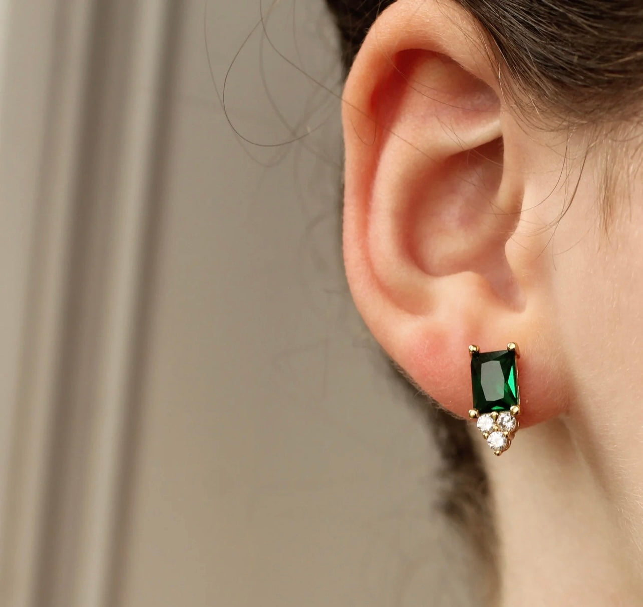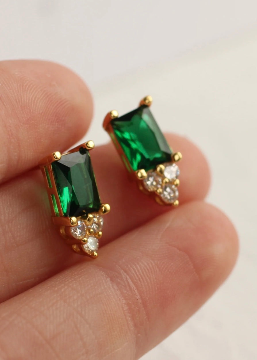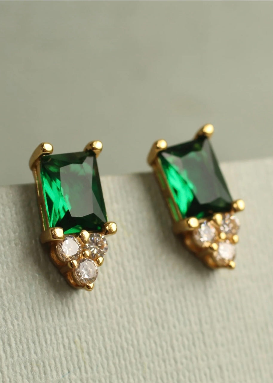 These beautiful and elegant Art Deco stud earrings are made with high quality emerald glass and crystal stones, set in 925 Sterling Silver.