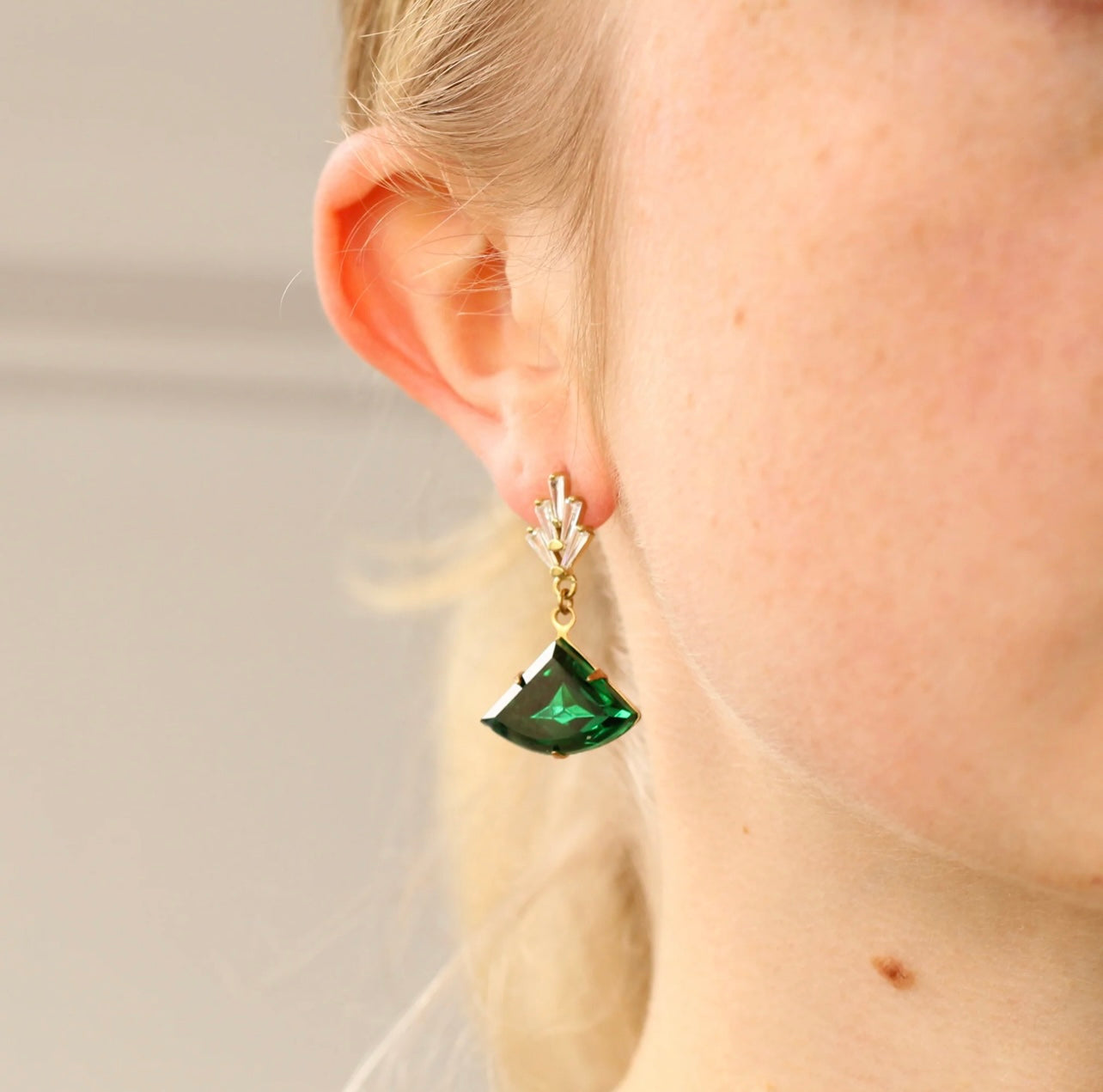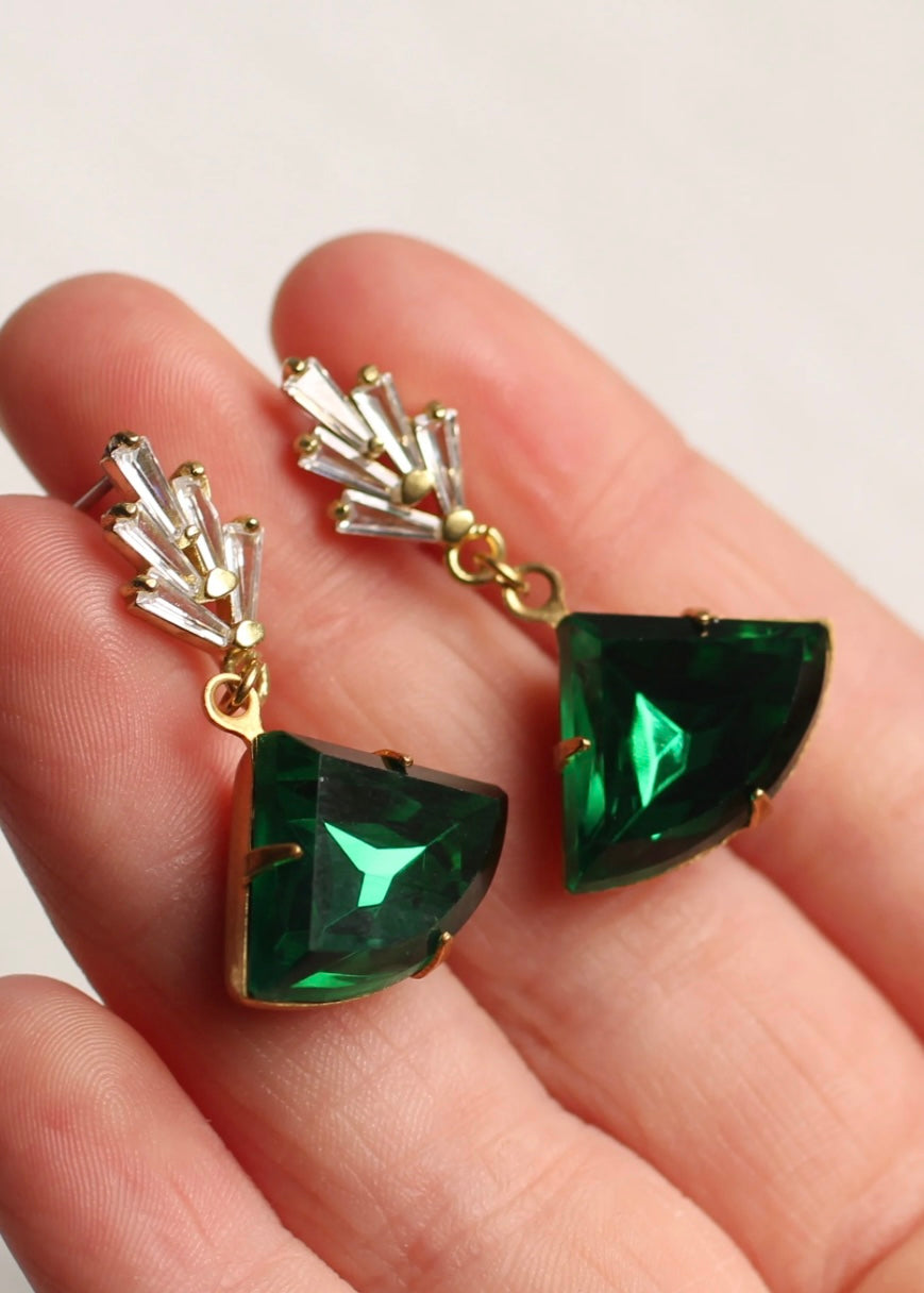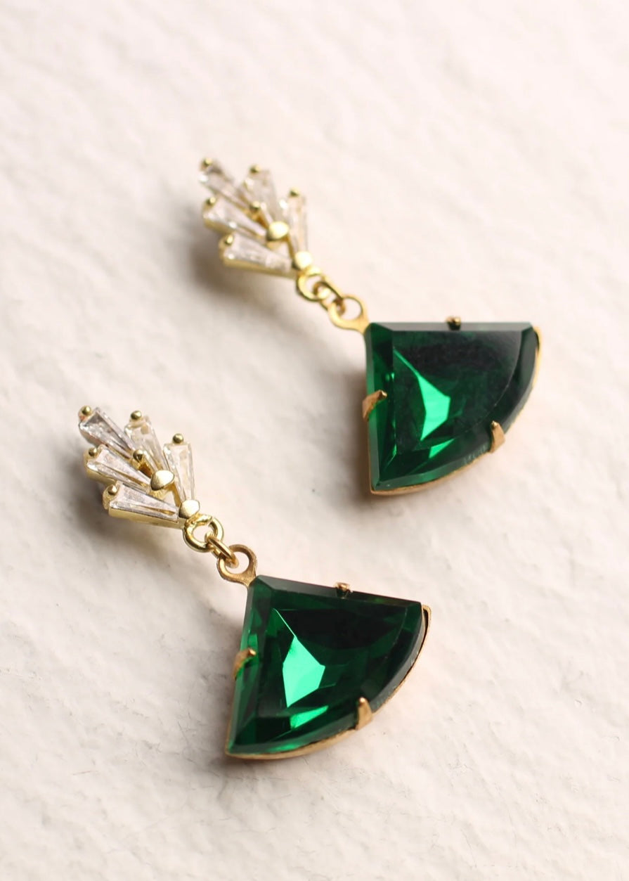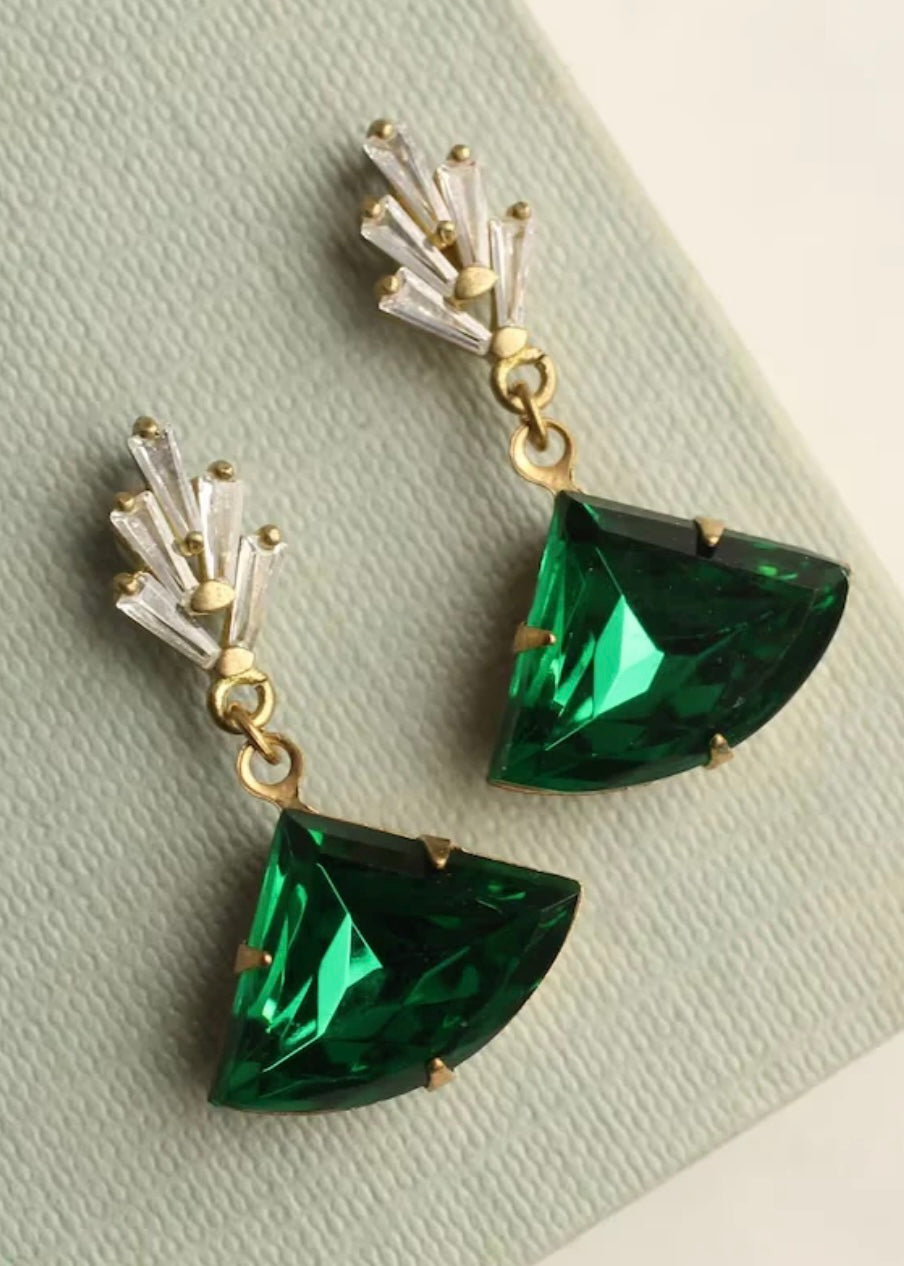 These great earrings are brass and feature a graduated art deco design. The tiny cubic zirconia jewels are cut into perfect rectangles. They remind us of classic Deco architecture, like the Chrysler building! The classically cut fan shaped stone is also glass in a beautiful, rich emerald green shade.