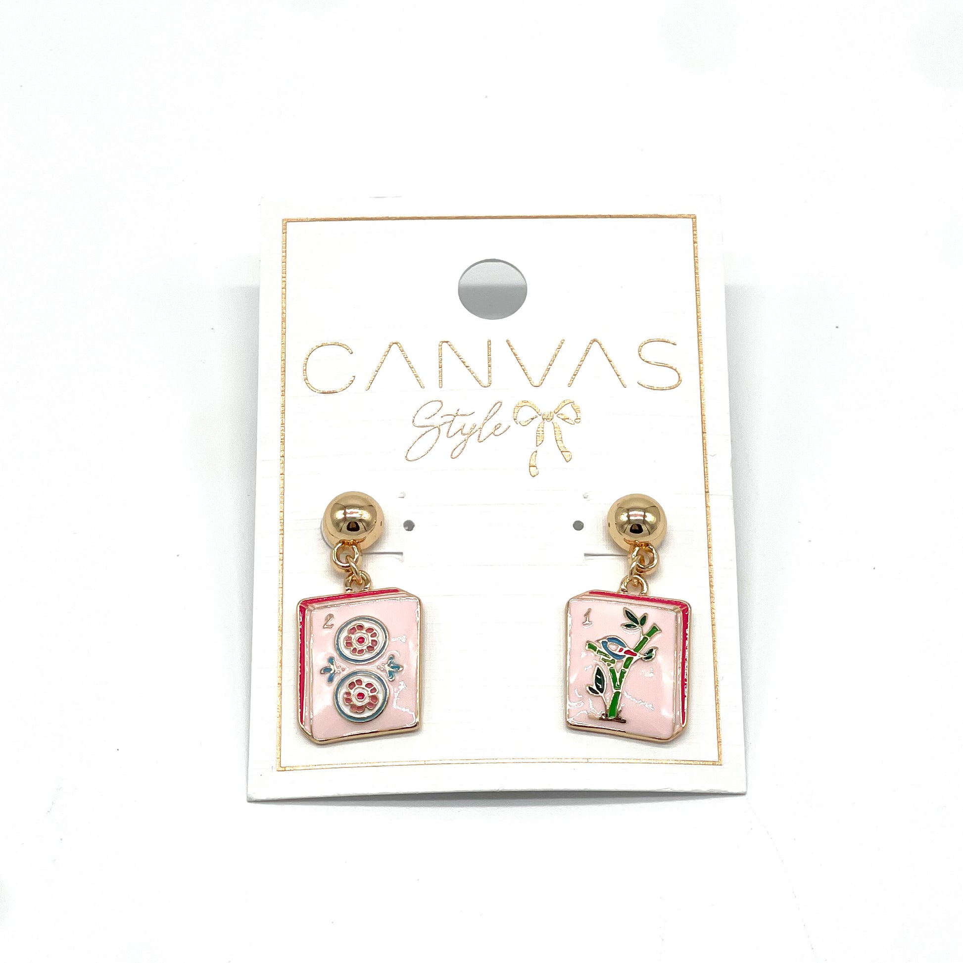 The Mahjong Tile Enamel Earrings in Light Pink feature enamel-coated Mahjong tiles in a soft pink hue. These earrings are perfect for adding a playful, vintage-inspired touch to any outfit, while the shiny gold accents elevate their charm.
