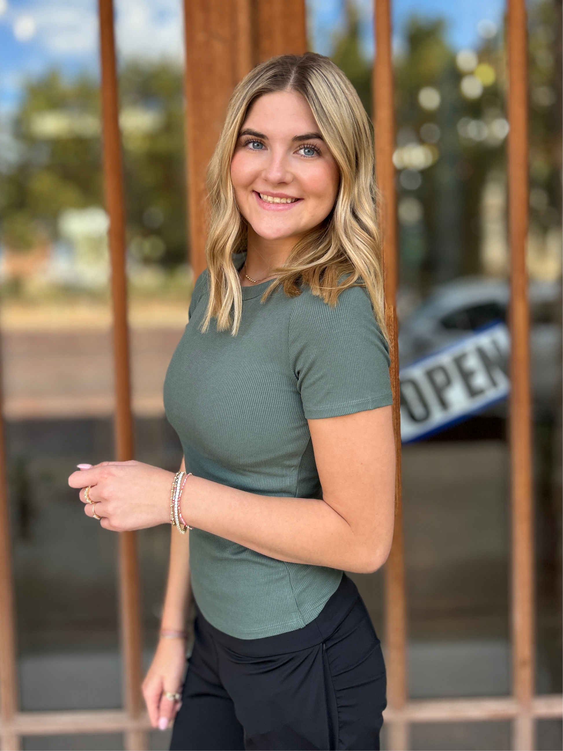 The perfect short sleeve top. Crafted from a rayon-spandex blend fabric with micro ribbing, this short sleeve top has a full coverage length, a rounded neckline, and a fitted silhouette.