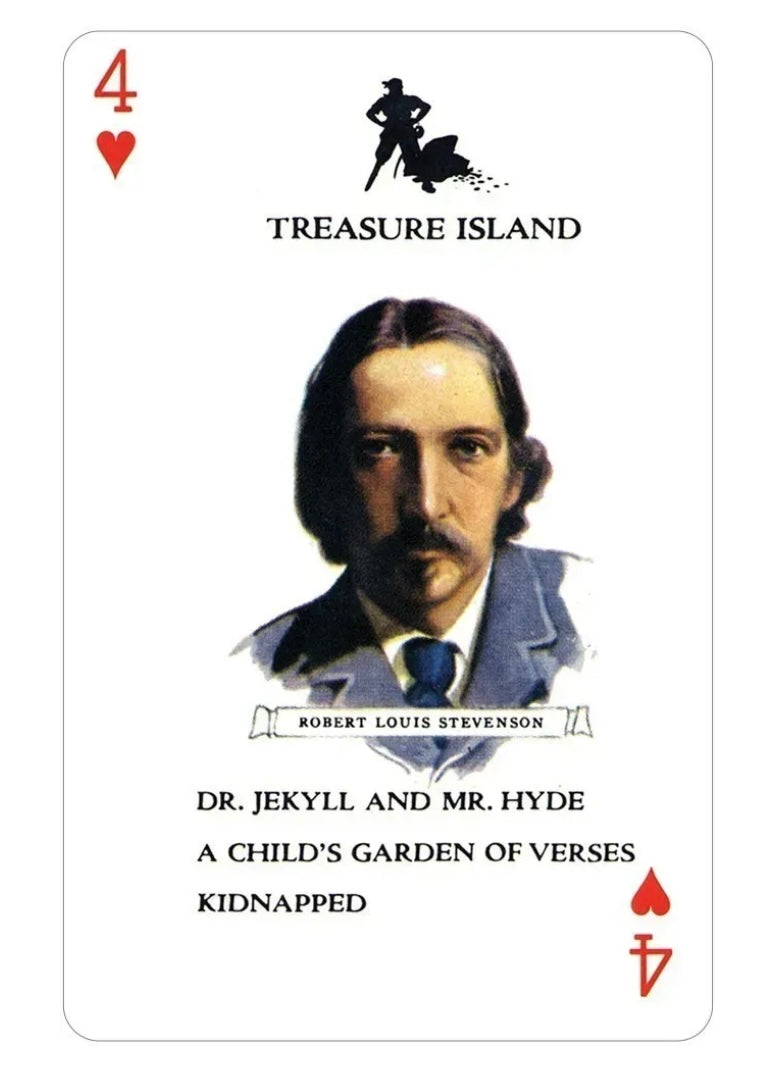Authors is a classic card game dating back to 1861. The Authors deck contains 52 cards featuring color portraits of 13 honored writers, with lists of their four greatest literary works. Still played today as it was originally, the Authors Card Game is played with these 13 books of 4 cards each. The object is to collect complete books by calling for cards from other players. The authors featured include: Mark Twain, Charles Dickens, William Shakespeare, William Thackeray, Robert Louis Stevenson, James Fenimore Cooper, Washington Irving, Nathaniel Hawthorne, Henry Longfellow, Sir Walter Scott, Alfred Tennyson, Louise May Alcott, and Edgar Allan Poe. The cards also have standard indices in both upper and lower corners. So the Authors deck can also be used for many traditional card games.