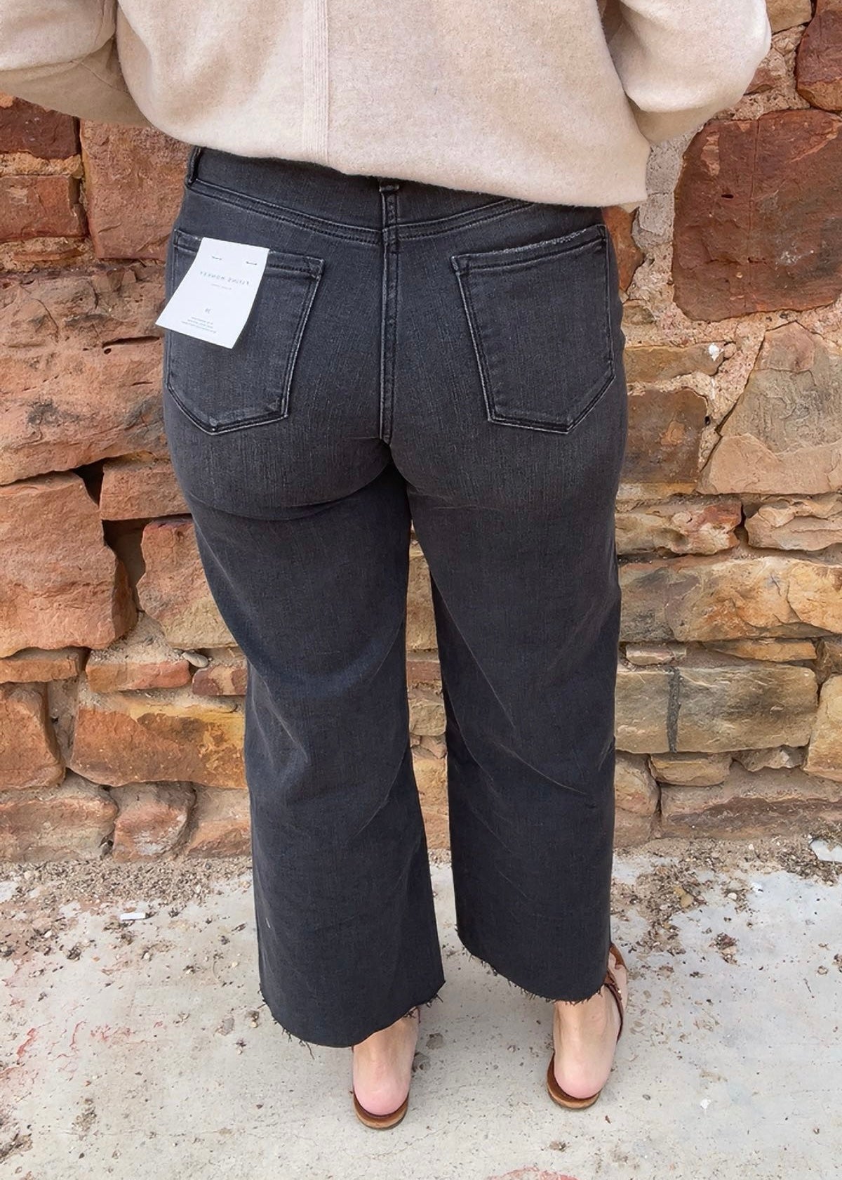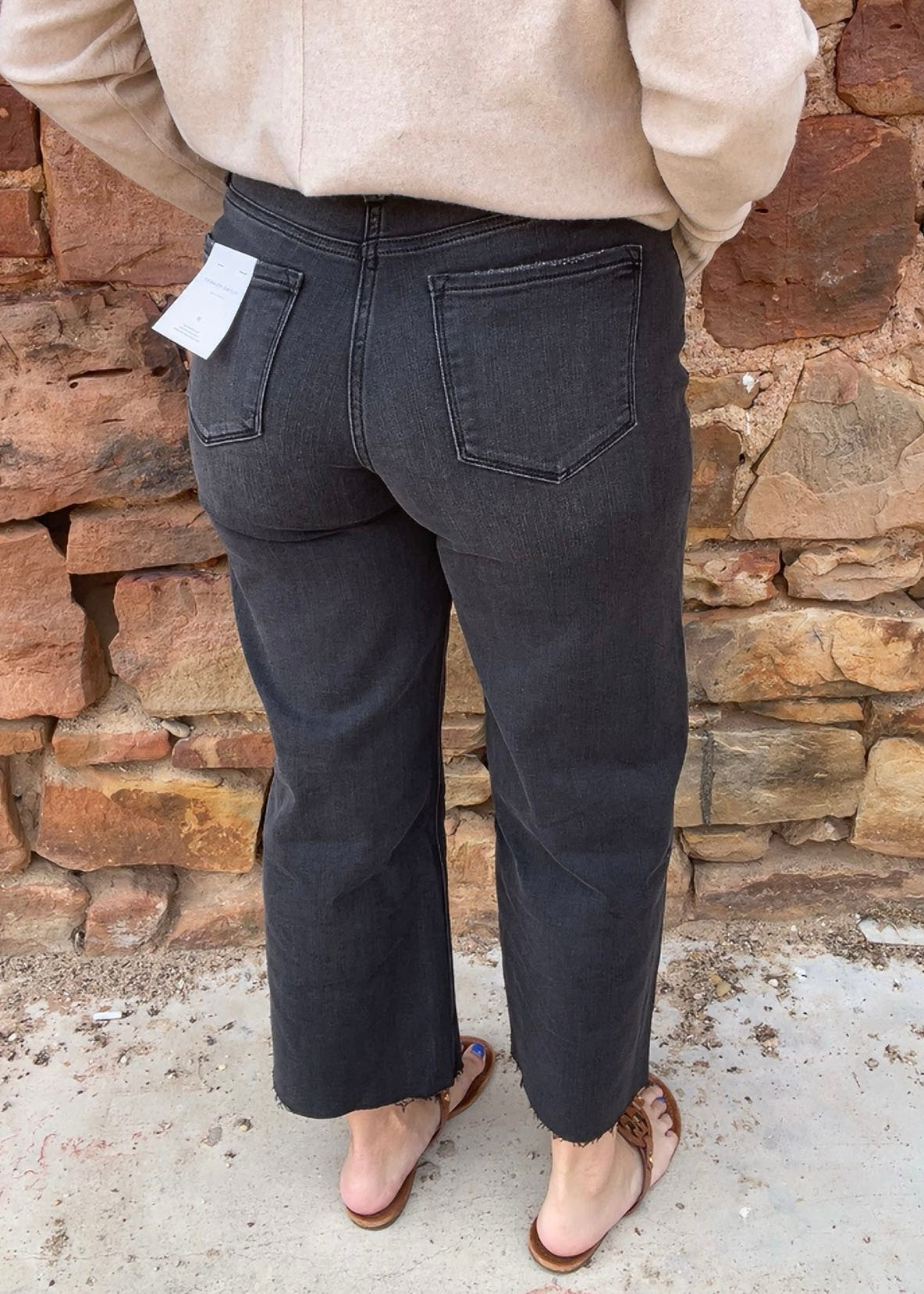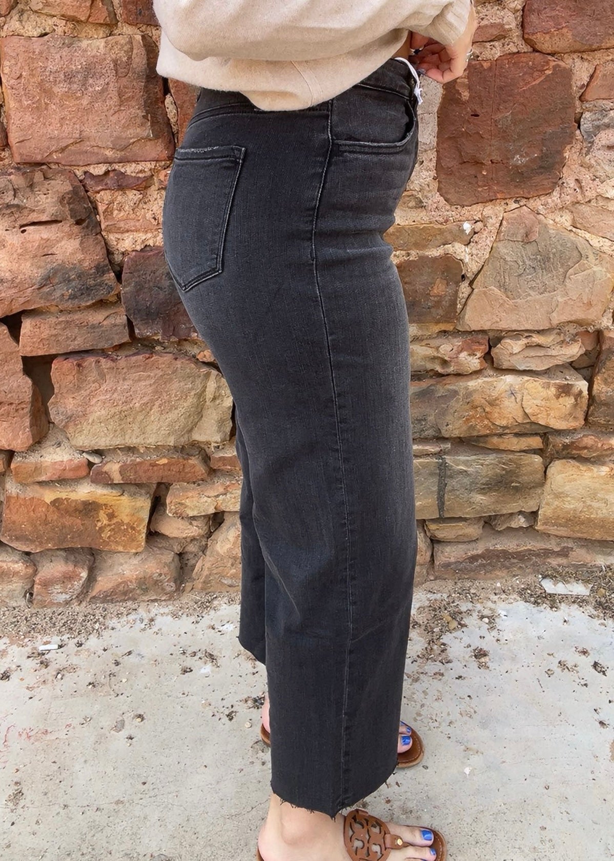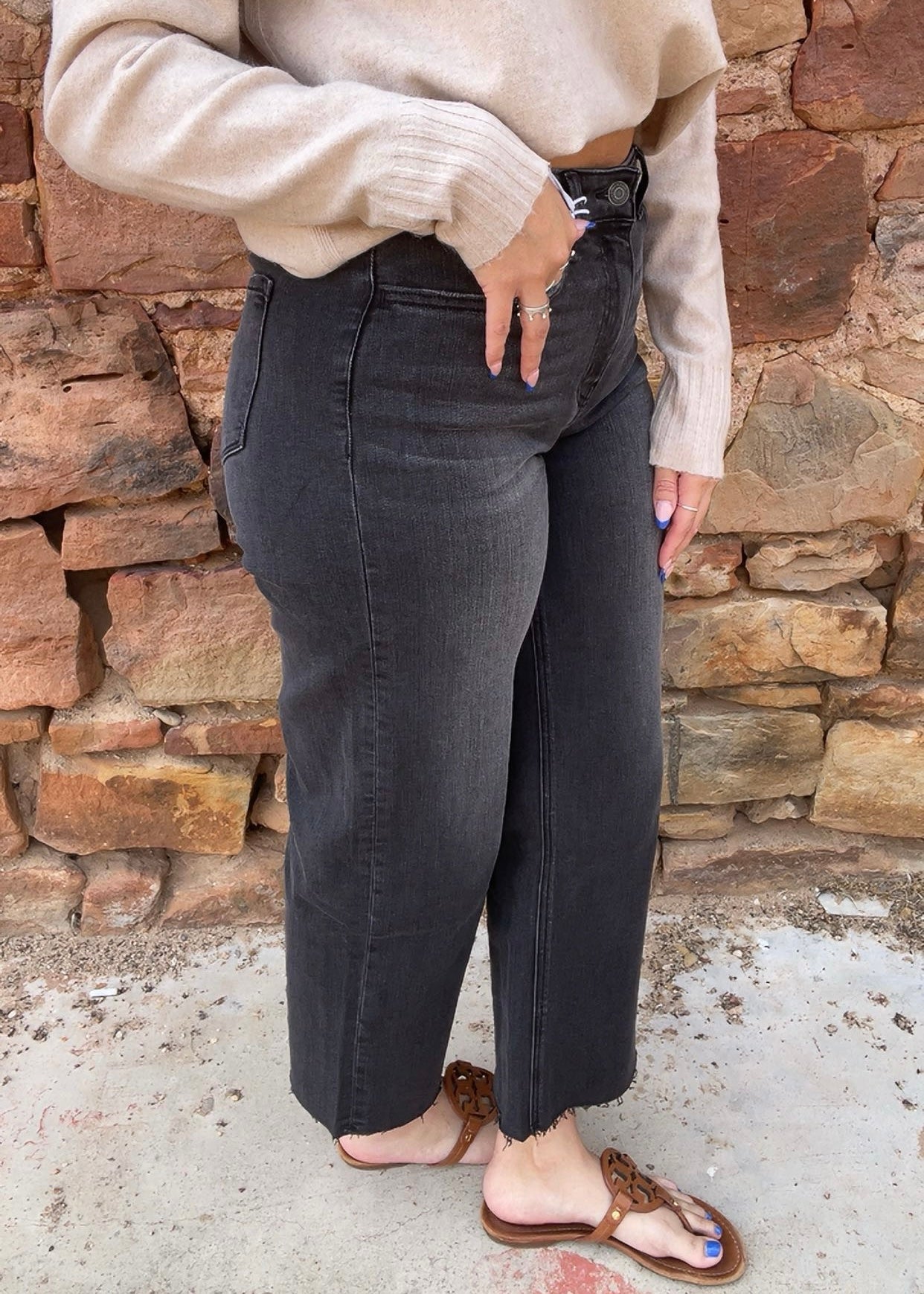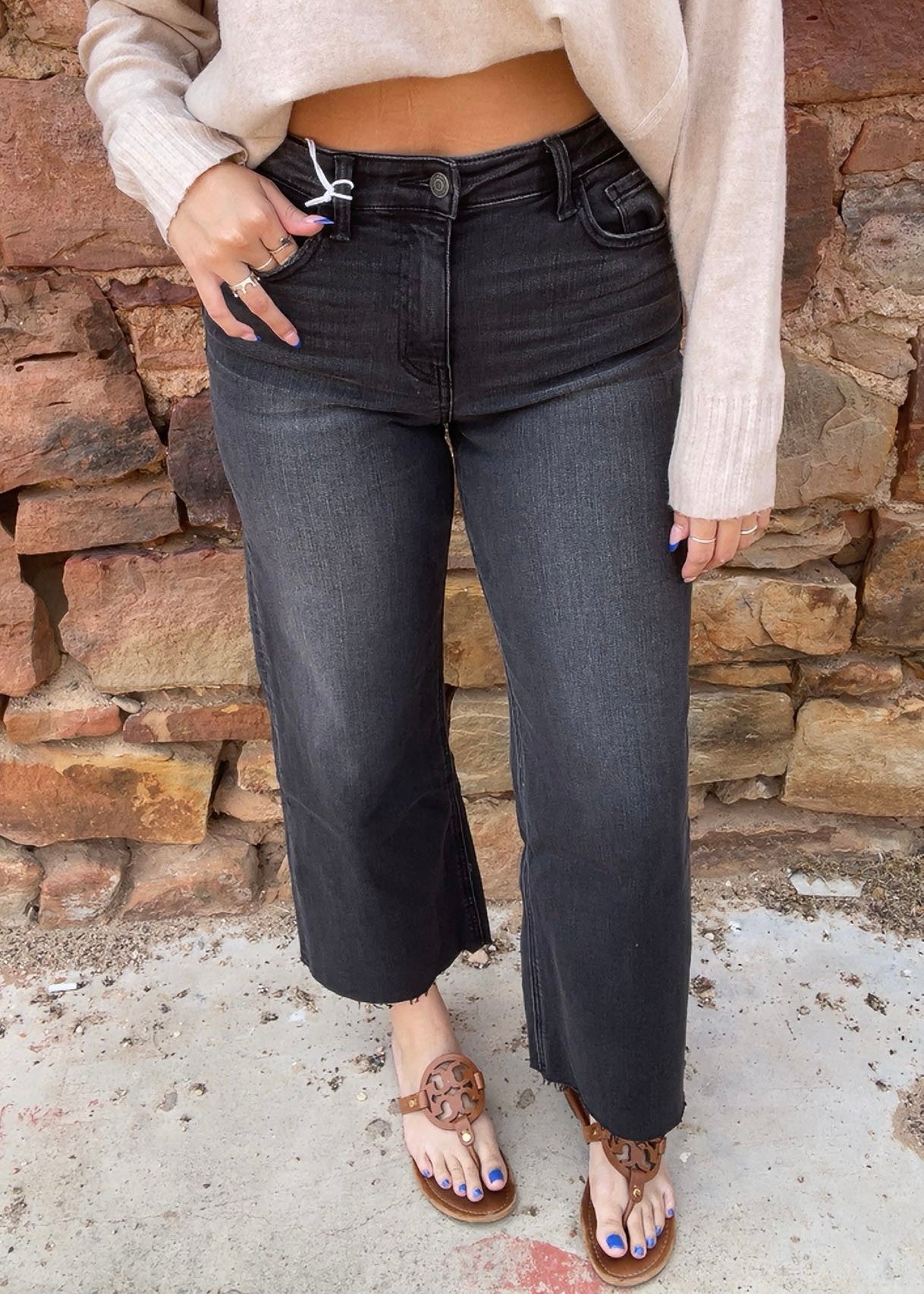 High rise clean cut raw hem crop wide leg jeans. Comfort stretch denim, high rise waist, clean cut raw hem, cropped length, wide leg jeans.