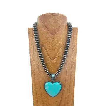 Add a touch of Western romance with this striking turquoise heart necklace. Featuring classic silver-tone desert pearls and a bold turquoise heart pendant, this piece blends rustic charm with heartfelt elegance. Perfect for layering or wearing solo, it’s a standout accessory that brings cowgirl spirit and timeless style to any look.