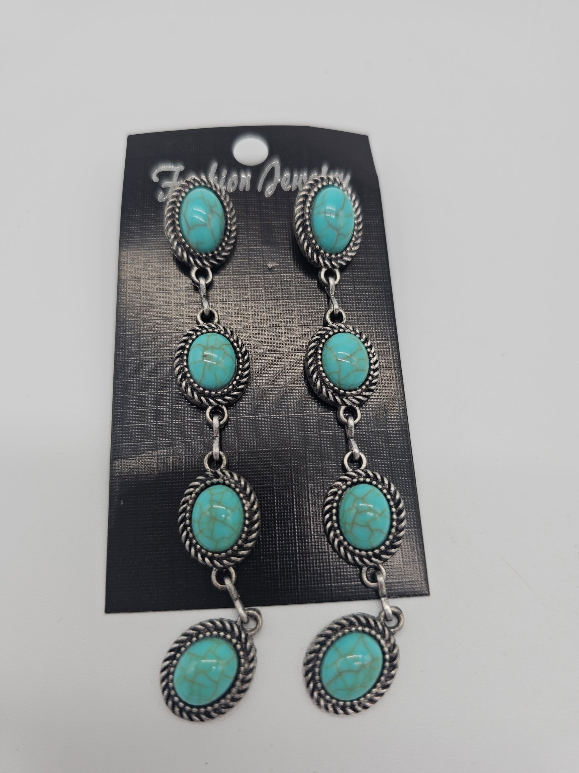 These stunning Western-style earrings feature a cascading row of turquoise stones, each set in an antique silver-tone rope frame. With their bold length and striking color, they bring a perfect mix of rustic charm and Southwestern flair. Lightweight yet eye-catching, these earrings are ideal for rodeo nights, festivals, or adding a statement to any outfit.