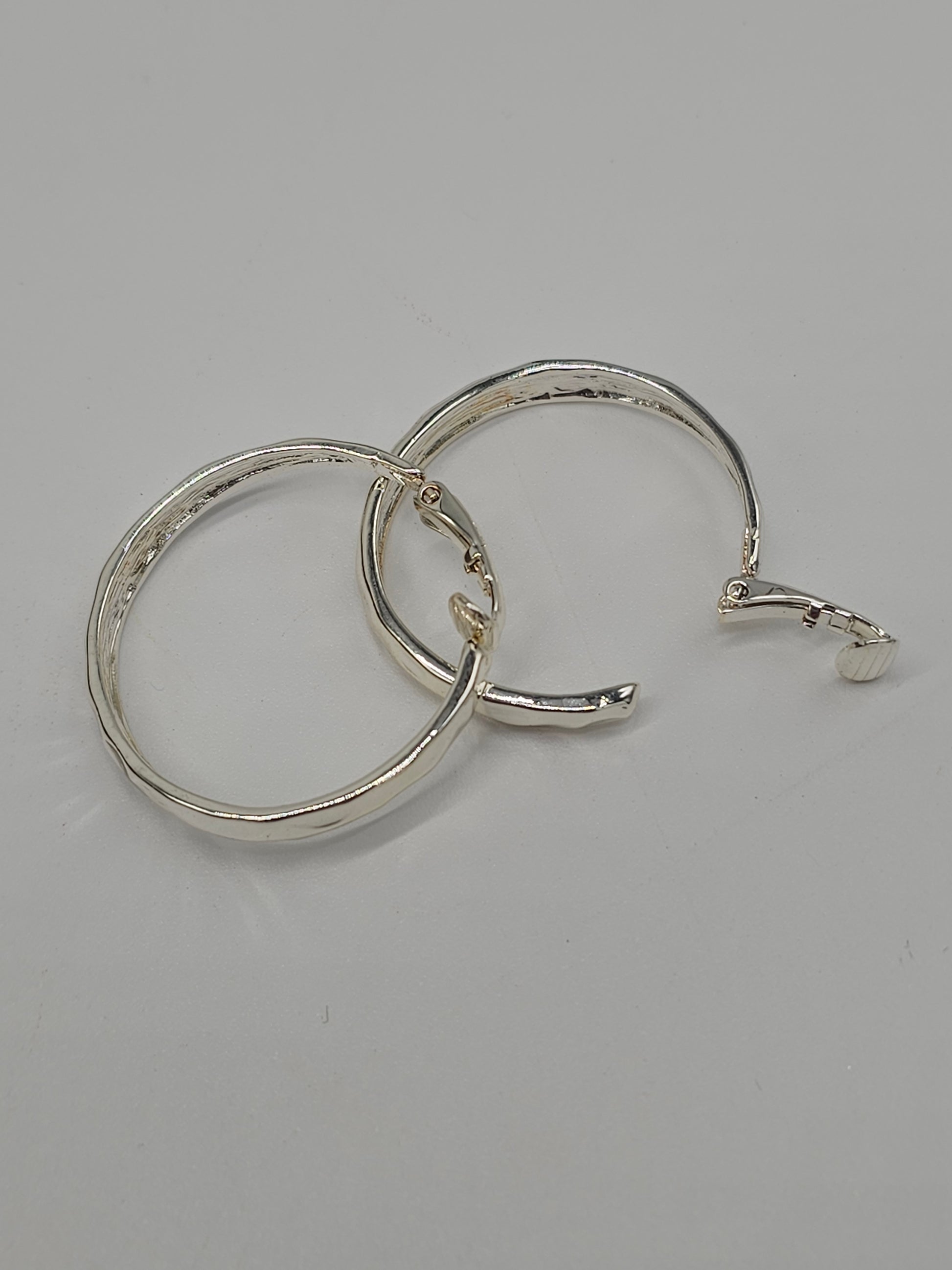 Silver textured hoop clip-on earrings with a hammered finish. Designed for comfort without pierced ears, these lightweight hoops add a classic and stylish touch to any look.