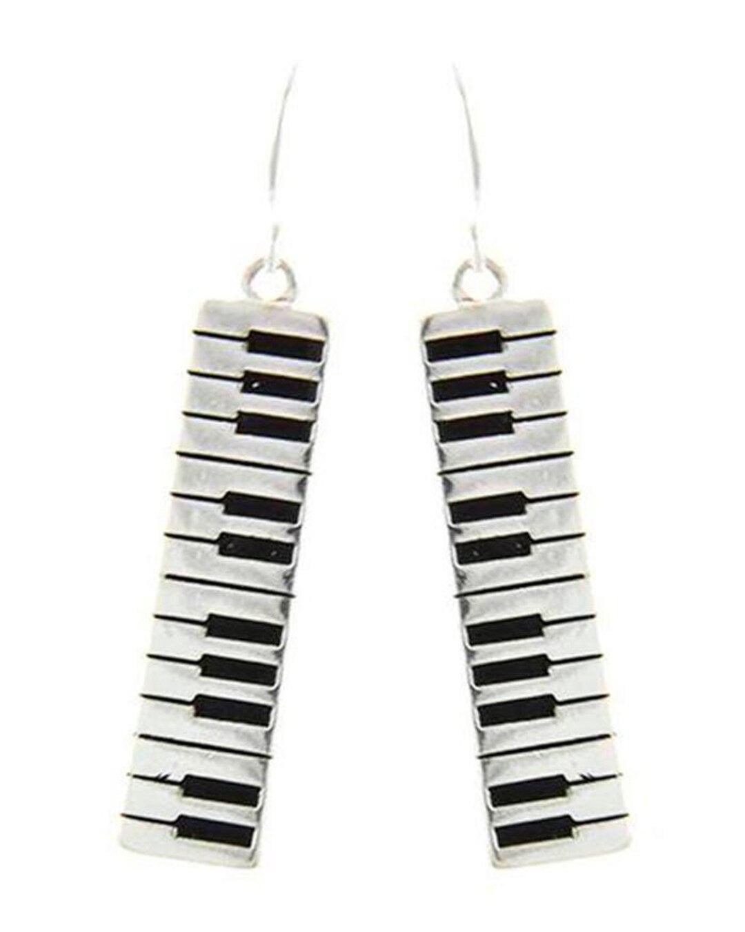 Silver dangle earrings designed in the shape of piano keys, featuring a sleek black and white enamel finish. A fun and stylish accessory perfect for music lovers. Lead, nickel, and cadmium safe.