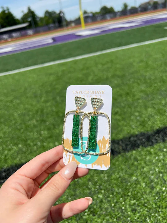 Sleek, sparkly, and full of team spirit—these green glitter bar rectangle earrings are perfect for your next game day look! Featuring a textured gold diamond stud, a rectangular open hoop frame, and a bold glittery green bar drop, they’re lightweight yet packed with personality. A winning accessory for football fans and fashion lovers alike!