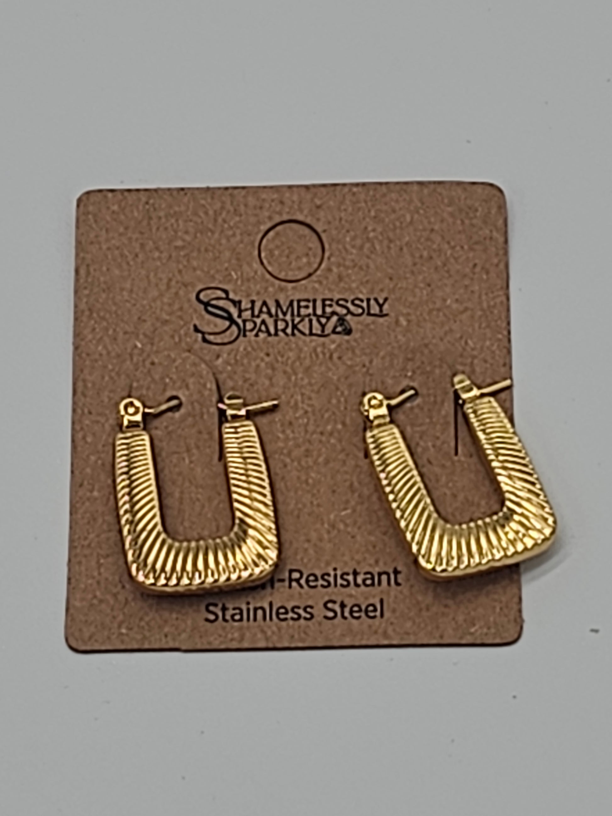Elevate your style with these bold gold U-shaped hoop earrings from Shamelessly Sparkly. Crafted from tarnish-resistant stainless steel, they feature a sleek ribbed texture that adds dimension and shine. Perfect for everyday glam or dressing up your night-out look. Lightweight, durable, and effortlessly chic!