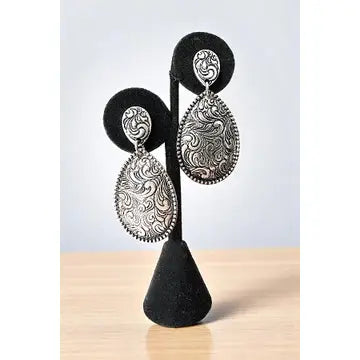 Show off your Western flair with these silver teardrop dangle earrings, featuring intricate etched detailing. A timeless accessory that adds rustic charm and elegance to any look.
