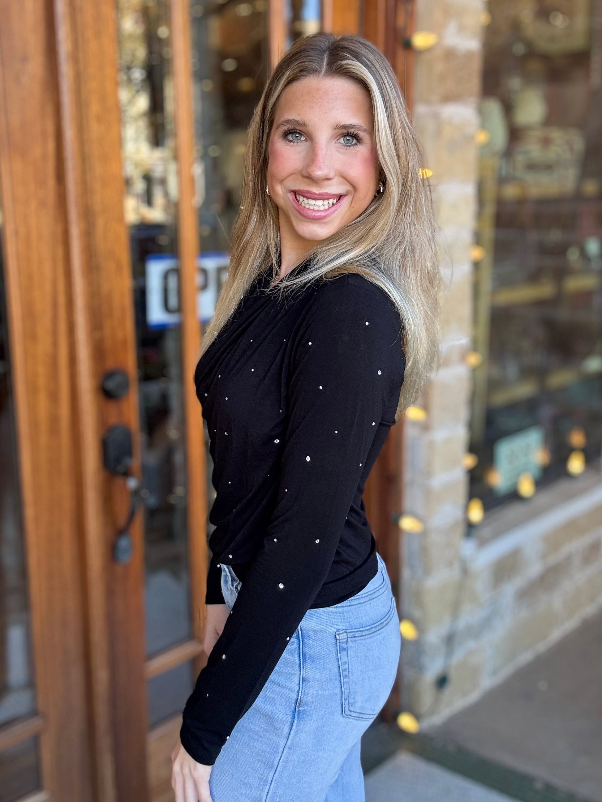 The Karen Kane Top brings a touch of sparkle to your everyday style. Crafted with a soft, fluid fabric, this top features a flattering draped crossover front. Subtle embellishments add just the right amount of shimmer. Finished with long sleeves.