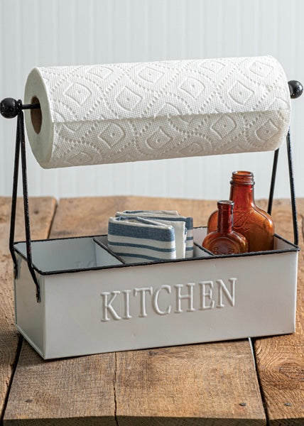 This polished white metal kitchen caddy is a great way to add to a dining room table or kitchen countertop. It has three divided compartments, perfect for utensils, napkins, or decorative items and is adorned with a black wooden handle. The handle can also be opened to allow a paper towel to be displayed.