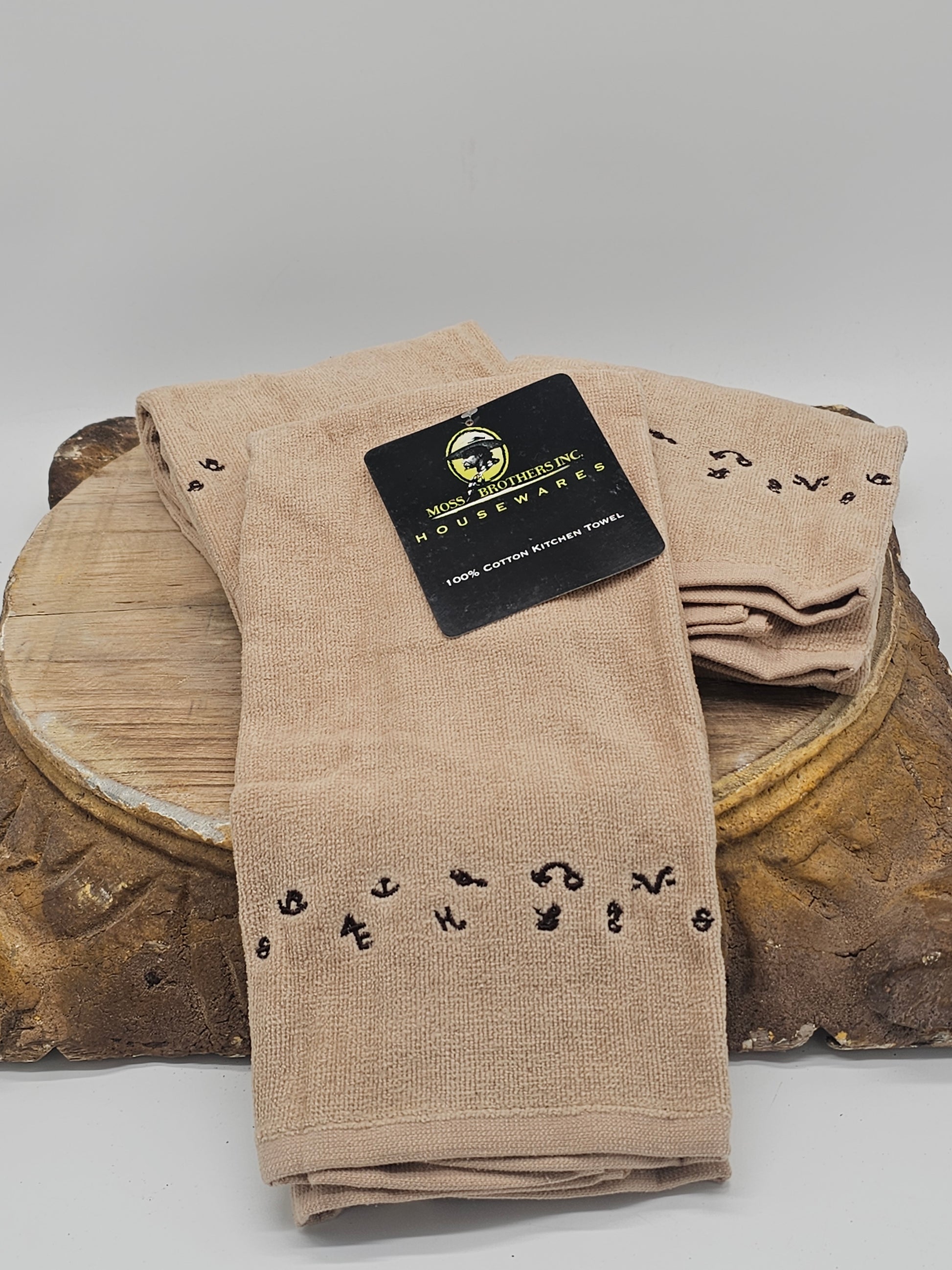 Rustic cotton hand towel crafted in a warm, natural tan shade with a soft, textured weave. Featuring black branded-style symbols along the edges, it adds a touch of Western charm to any kitchen or bath space. Durable yet stylish, this towel blends everyday functionality with rustic farmhouse appeal.