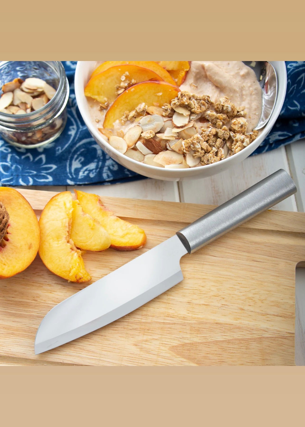 This knife will maneuver like a paring knife but give you the control and versatility of a larger knife. This is a knife that anybody—whether or not they’re experienced in the kitchen—will find many ways to use.