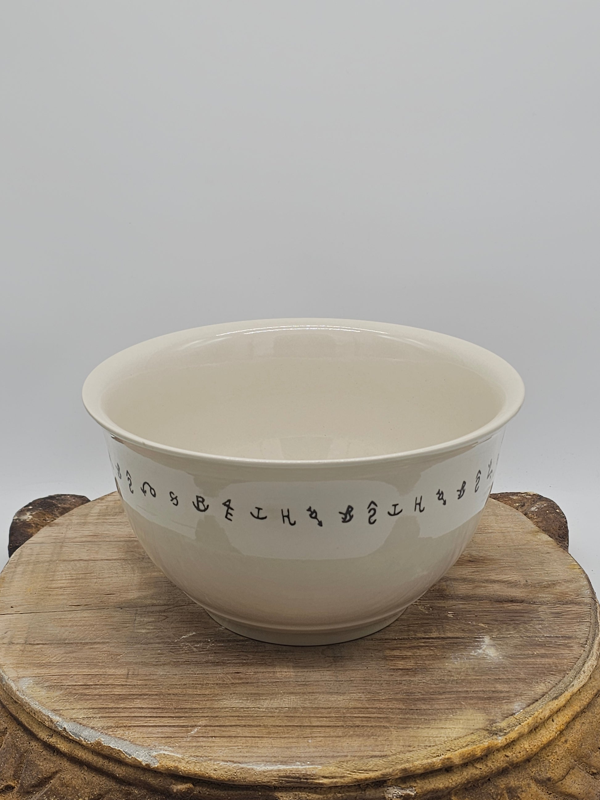 Large ceramic bowl in a creamy neutral tone, accented with black branded-style designs encircling the rim. Its rustic Western-inspired look makes it perfect for serving, displaying, or as a decorative centerpiece. Both functional and stylish, this bowl adds a touch of farmhouse charm to any kitchen or dining table.