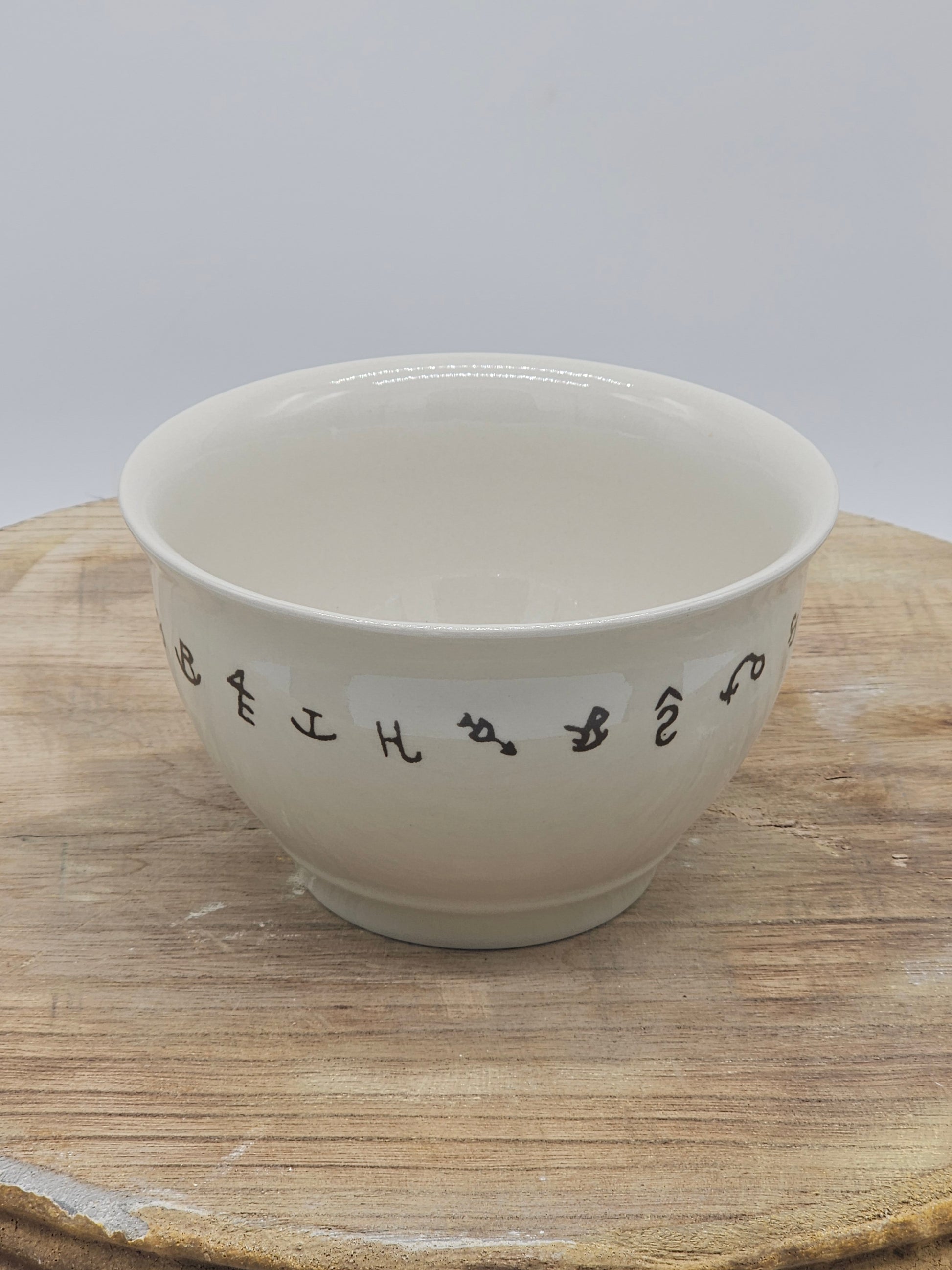 Small ceramic bowl in a creamy neutral tone, accented with black branded-style designs encircling the rim. Its rustic Western-inspired look makes it perfect for serving, displaying, or as a decorative centerpiece. Both functional and stylish, this bowl adds a touch of farmhouse charm to any kitchen or dining table.
