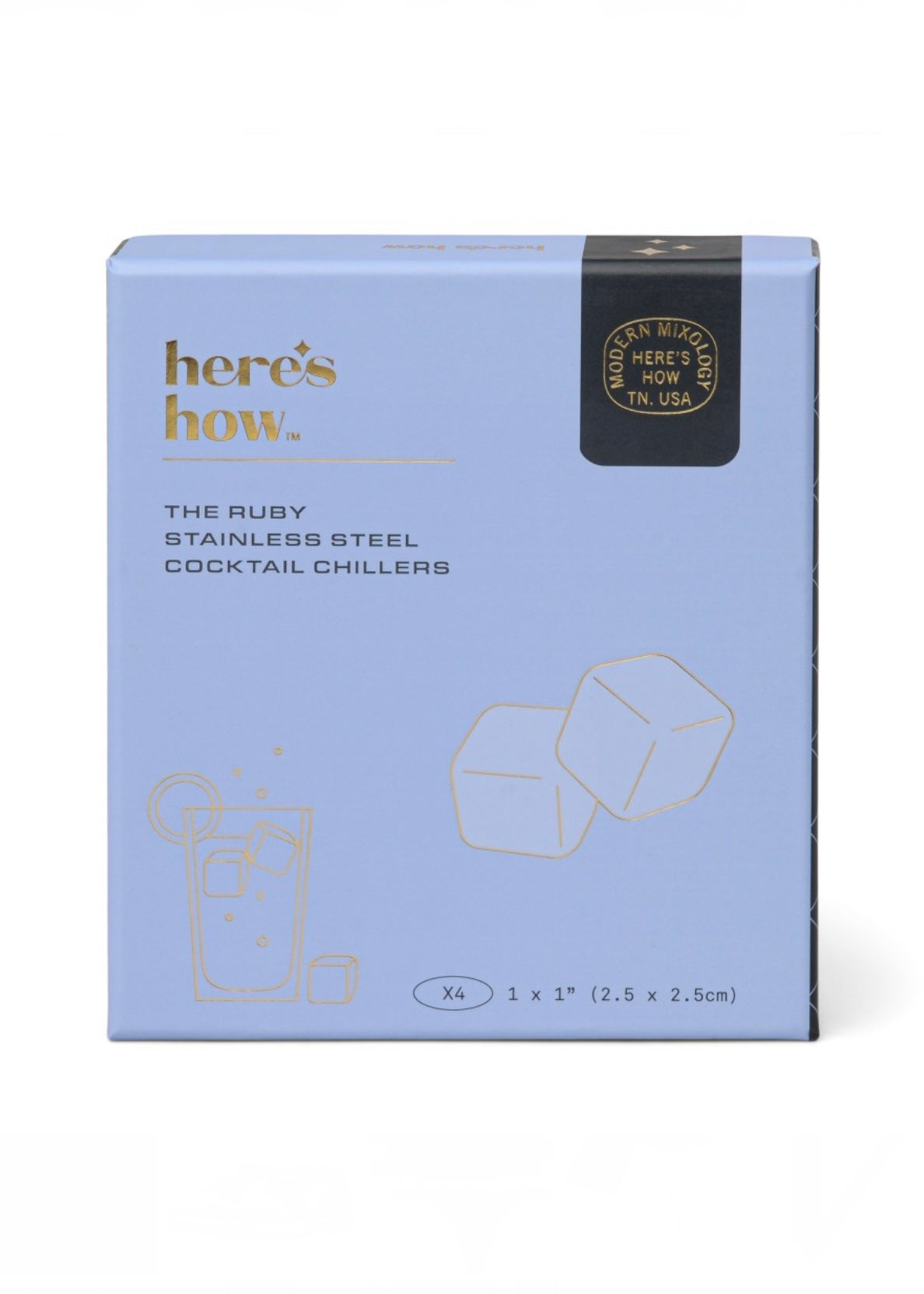 Chill your drink with this classic set of metal coolers. Designed to chill your drink without diluting it, these four metal cubes are perfect for your next gin cocktail or even an iced coffee. In the box you will also find a convenient bag to store the coolers.