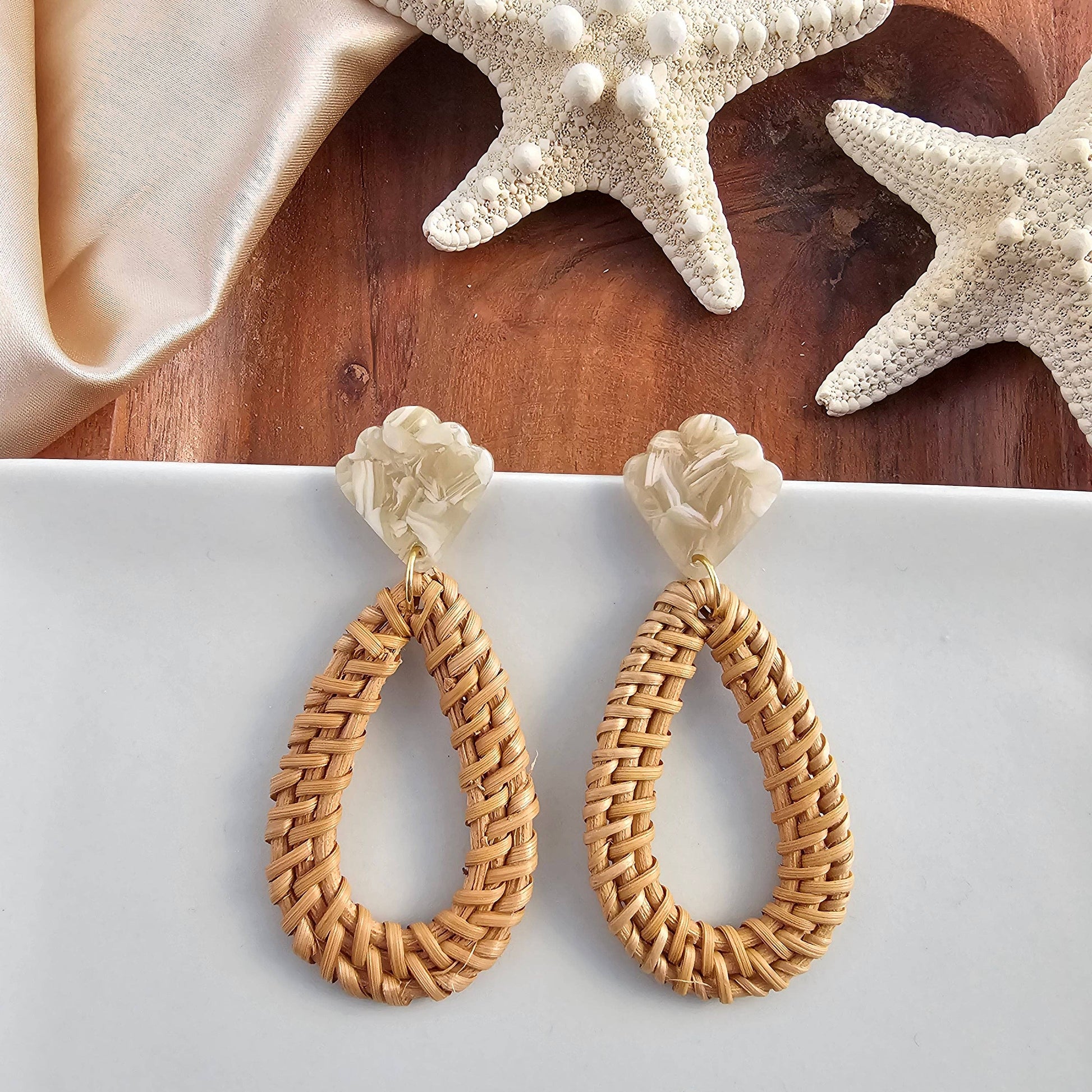Get ready to add some tropical vibes to your look with our Malia Earrings! These lightweight earrings feature a charming seashell-inspired stud, paired with a trendy rattan drop design. Perfect for any occasion, these earrings will make you feel like you're on vacation wherever you go. Hypoallergenic stainless steel posts Durable plant-based acrylic posts Hand-woven rattan wood.