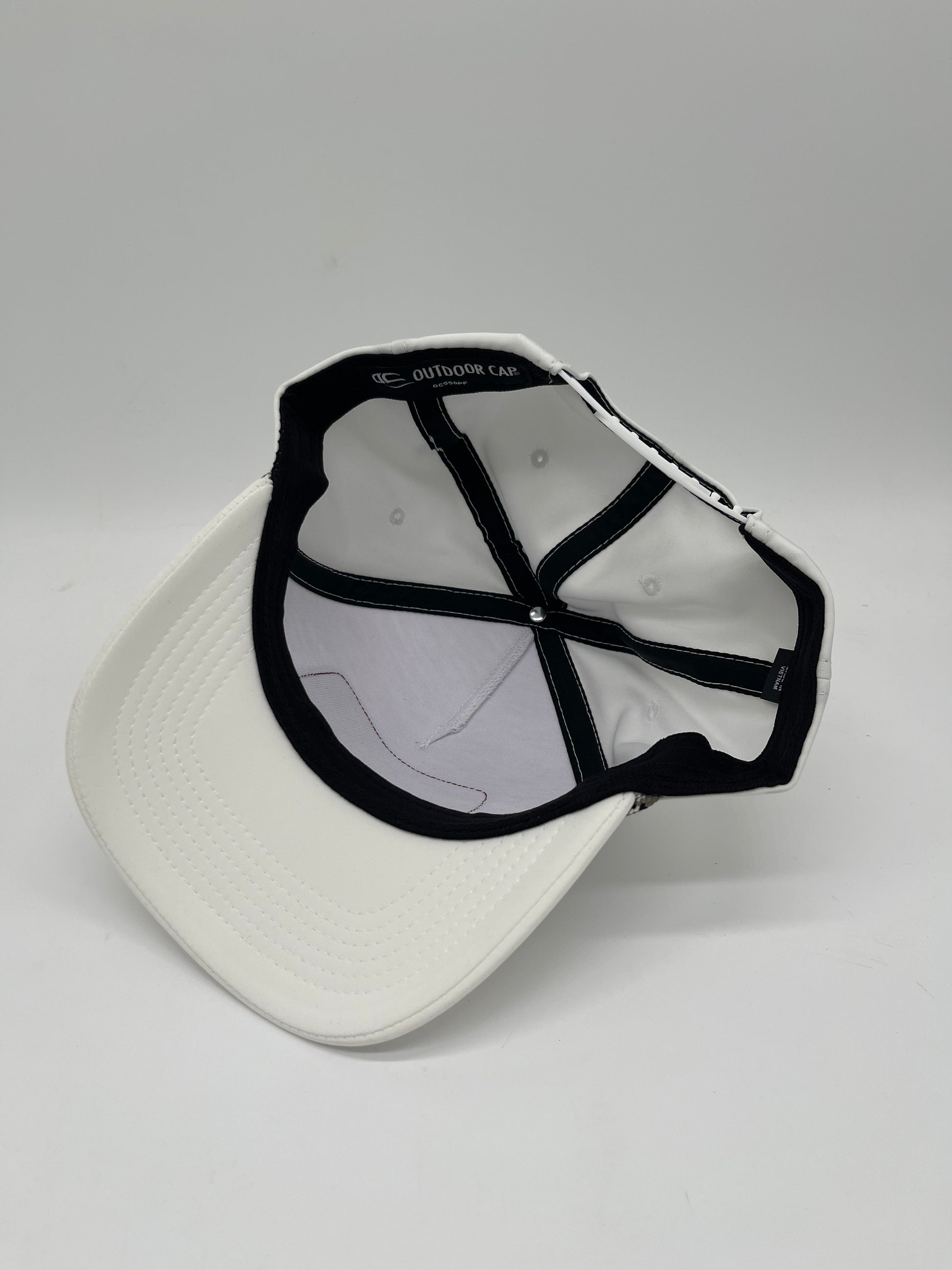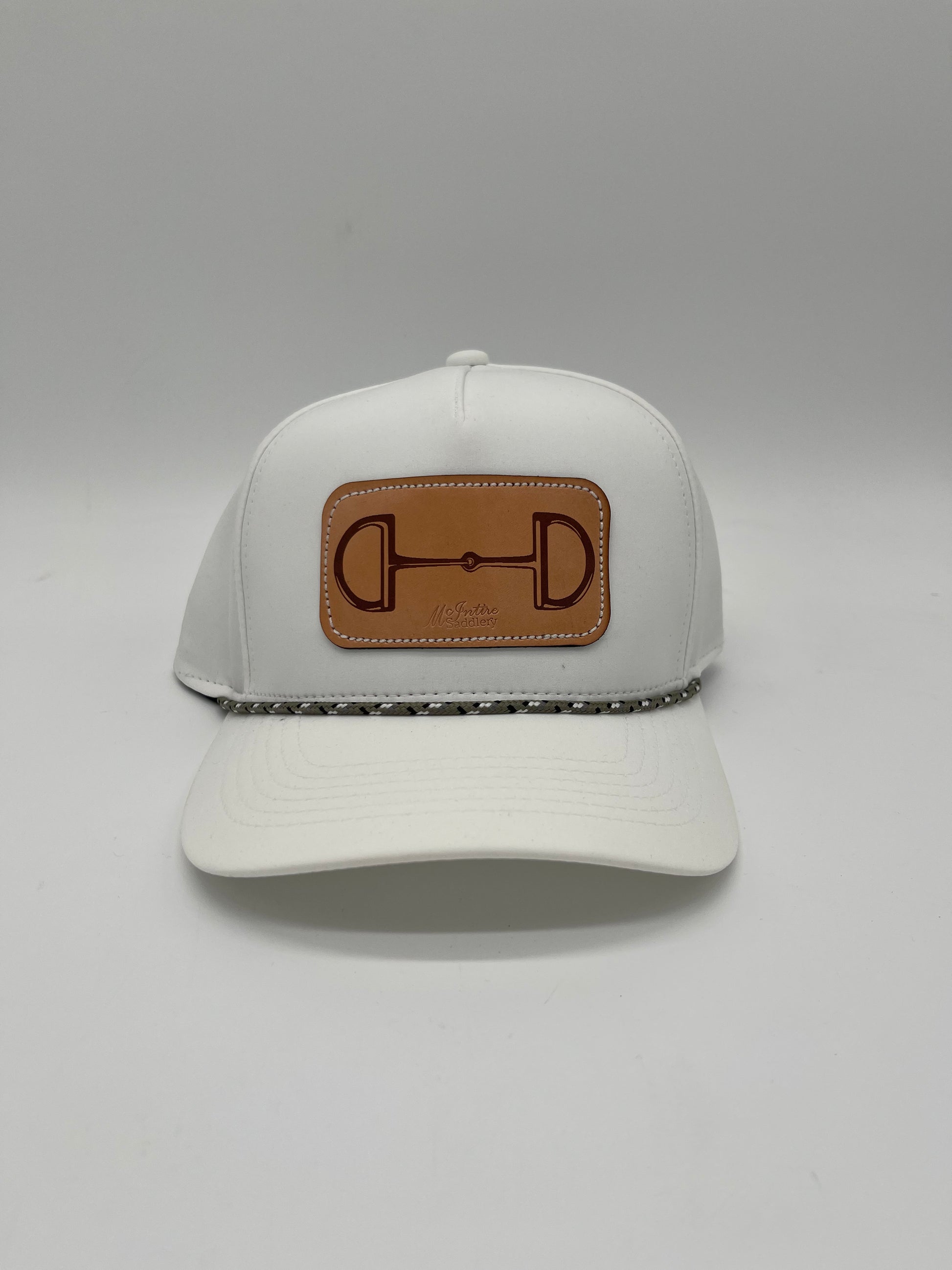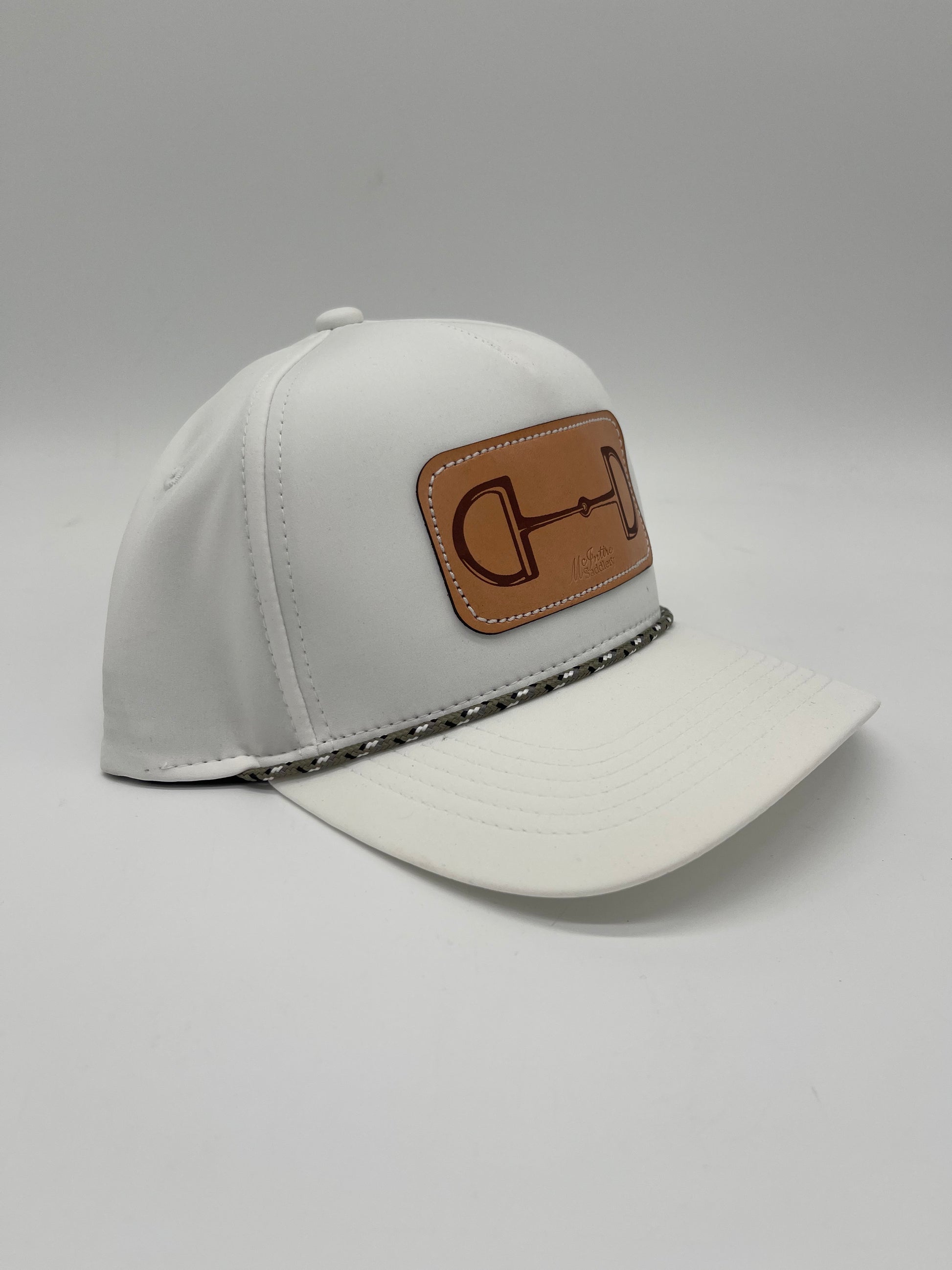 Elevate your everyday look with this crisp white cap featuring a genuine leather patch stamped with a sleek bit design—perfect for adding a touch of western charm with modern style. The structured crown and curved bill give it a timeless fit, while the olive braided trim detail adds a subtle pop of personality.
