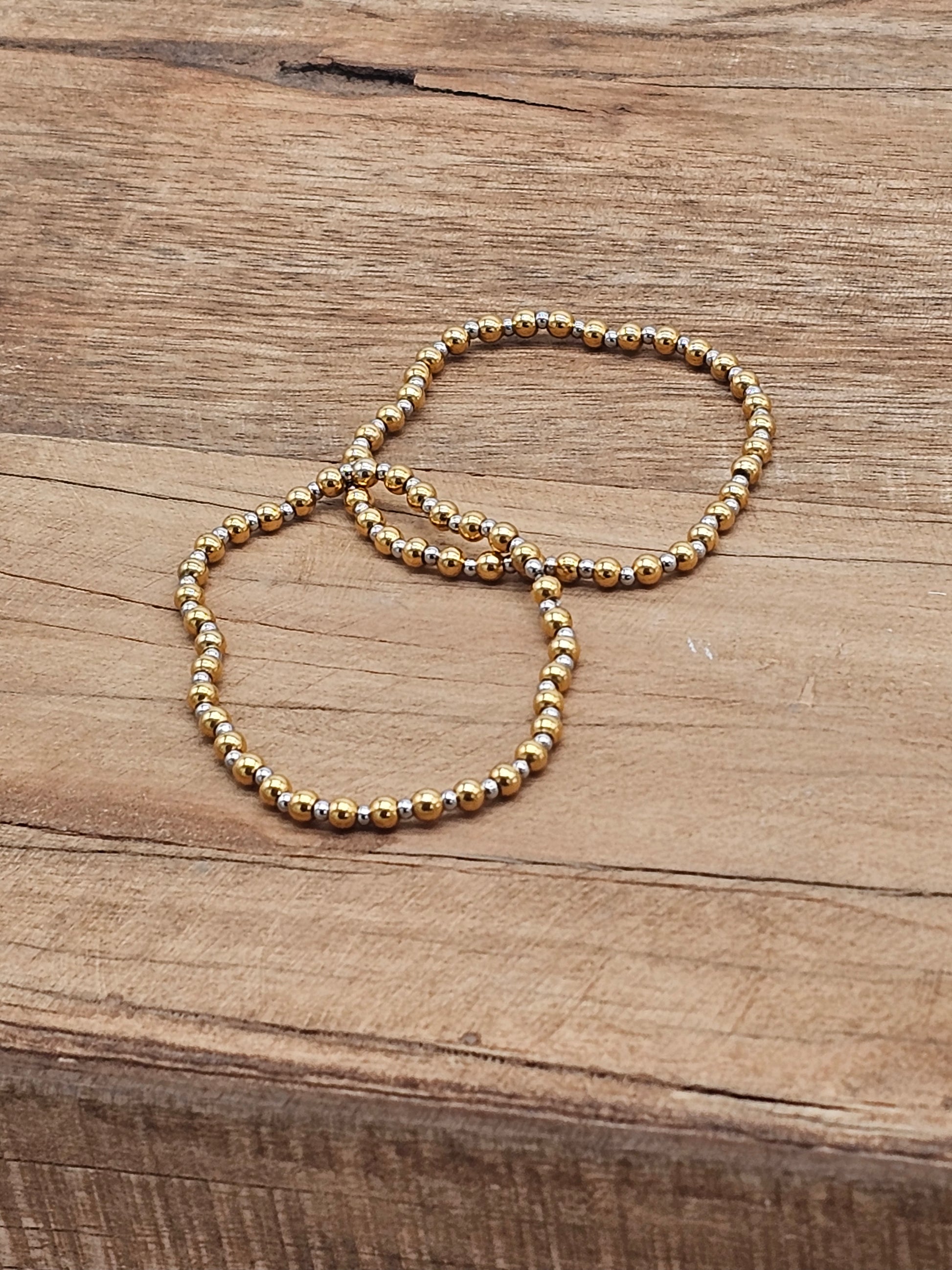 A timeless mixed-metal bracelet featuring alternating gold and silver tone beads for effortless everyday style. Designed on a comfortable stretch fit, this versatile piece layers beautifully with other bracelets or stands alone for a clean, classic look. Perfect for mixing metals and adding a subtle touch of shine to any outfit.