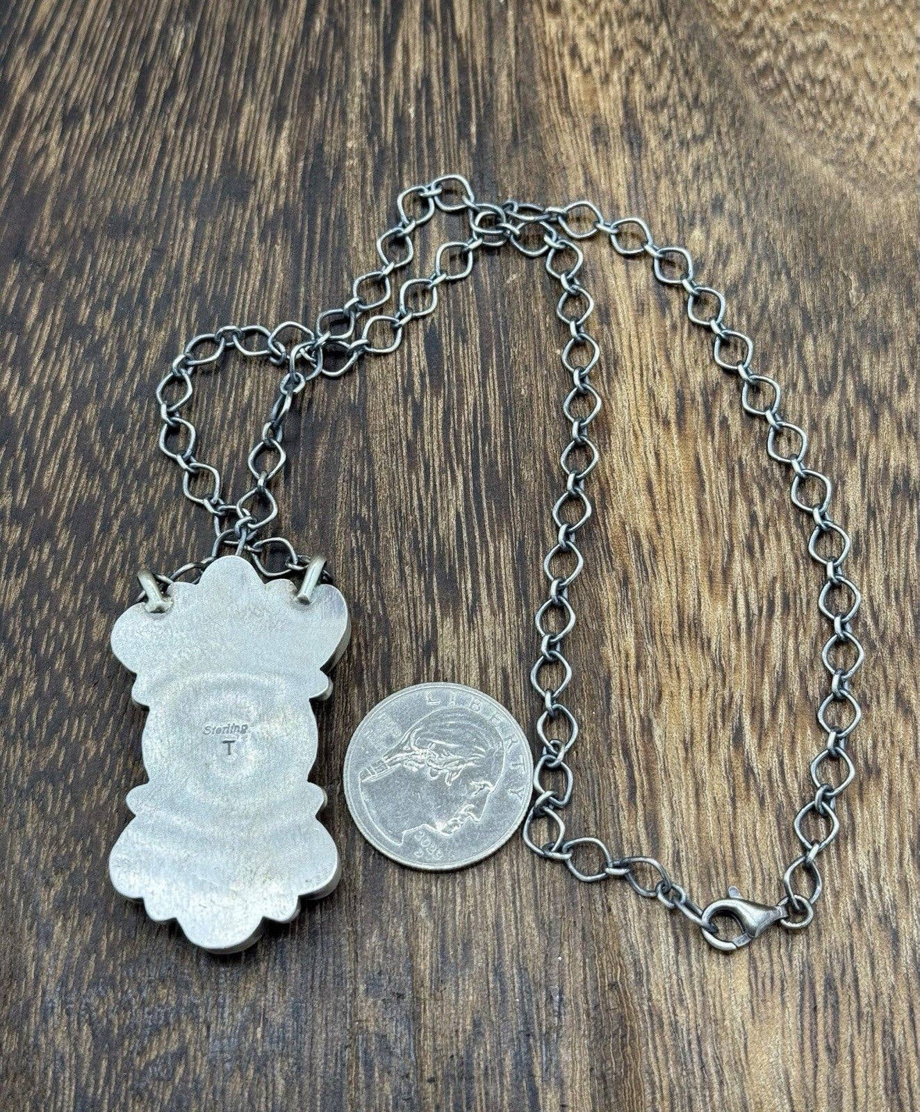 This exquisite cluster necklace is a true work of art handcrafted by Native American artisan Tricia Smith, The stunning cluster shaped necklace features beautiful white water Turquoise stones set in .925 sterling silver bezel. The pendant hangs on an 18-inch chain with lobster closure, making it a perfect accessory for any occasion.