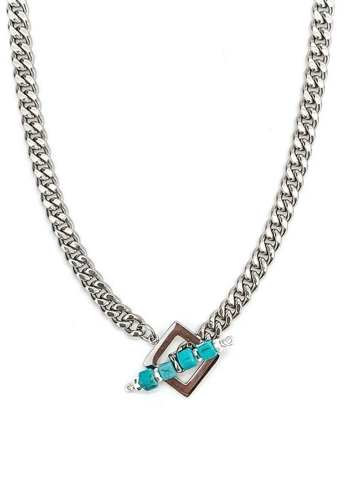 Add a pop of color to your wardrobe with the Molly Choker Chain! This silver chain choker features a stunning turquoise detail that will elevate any outfit. Get ready to turn heads and show off your unique style with this playful and trendy accessory.
