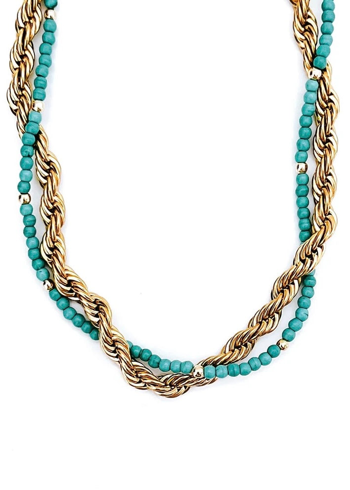 Add a double dose of style with the Jenny Necklace. This playful piece features a double strand of turquoise beads and a trendy gold waterproof chain. Perfect for adding a pop of color to any outfit. (Double trouble never looked so good!)