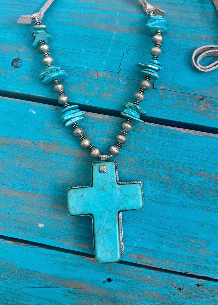 Beautiful large turquoise cross with pretty Indian carving to wear with front or back makes this a multi use piece. The strands of Tibetan silver and turquoise complete this unique look.