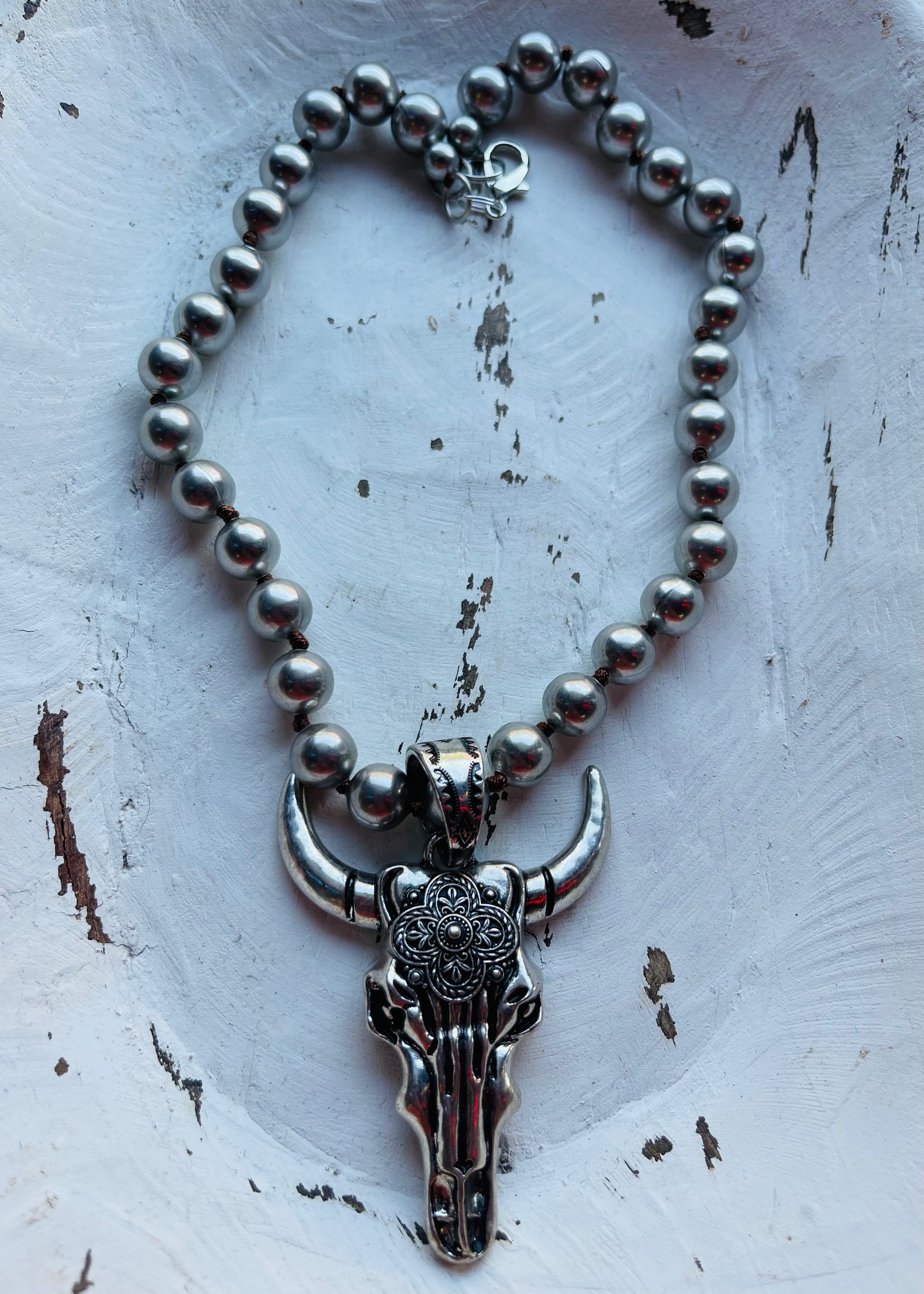 This necklace is hand knotted with 12MM silver metal beads. Pendant has a big bail with etched design on it that allows you to take it off and use it on any other strand or wear necklace by itself as a layer piece or with another pendant. Length: 20" + 2.25"pendant Pendant: 2.25" L x 2.75" W Bail: 0.75" bail Clasp: Lobster Claw.