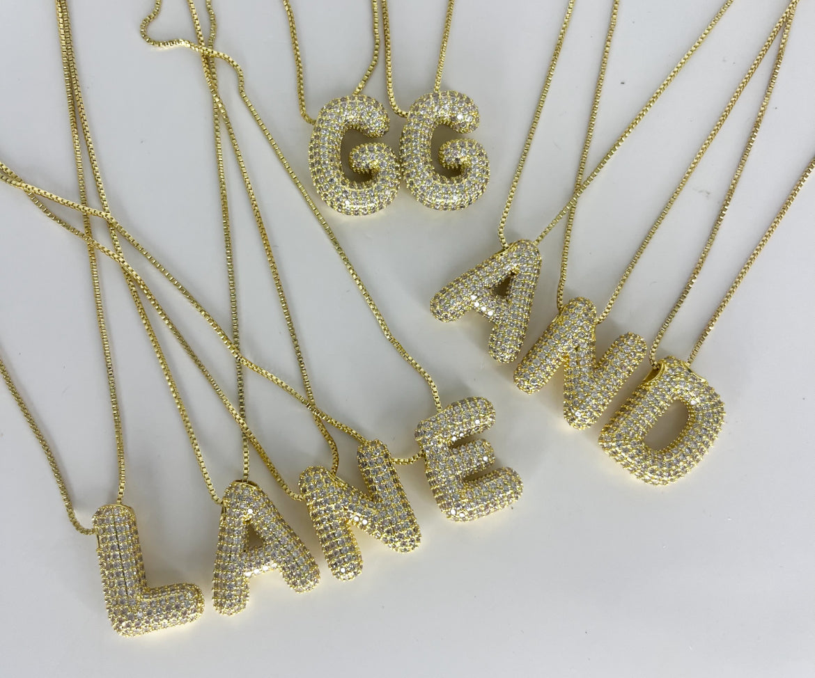 Shine bright with this Initial Pave Rhinestone Bubble Balloon Necklace! This unique necklace features a bubble letter pendant encrusted with sparkling rhinestones, adding a touch of personalized glam to any outfit. Perfect for expressing yourself or gifting to someone special.